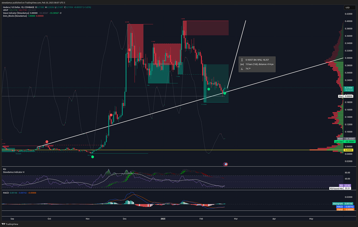 Hedera Hashgraph ($HBAR) is one of the top alts currently being considered for a future ETF. I’ve received not one but two green dot signals within that large liquidity block. This tells me that institutional money and whales are accumulating this gem here. And it is on good support which I don’t see us breaking. If you entered at the time of this post (not fin advice), I could see holding to at least that recent high for a potential profit of 84% plus. If it were me, I’d set my stop out just below that recent pivot low.