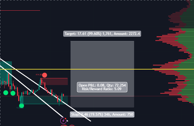 In the case of this crypto, we’ve broken two resistance down-trends and have entered an area of high trading volume. My indicator agrees. This seems to be a good entry here.