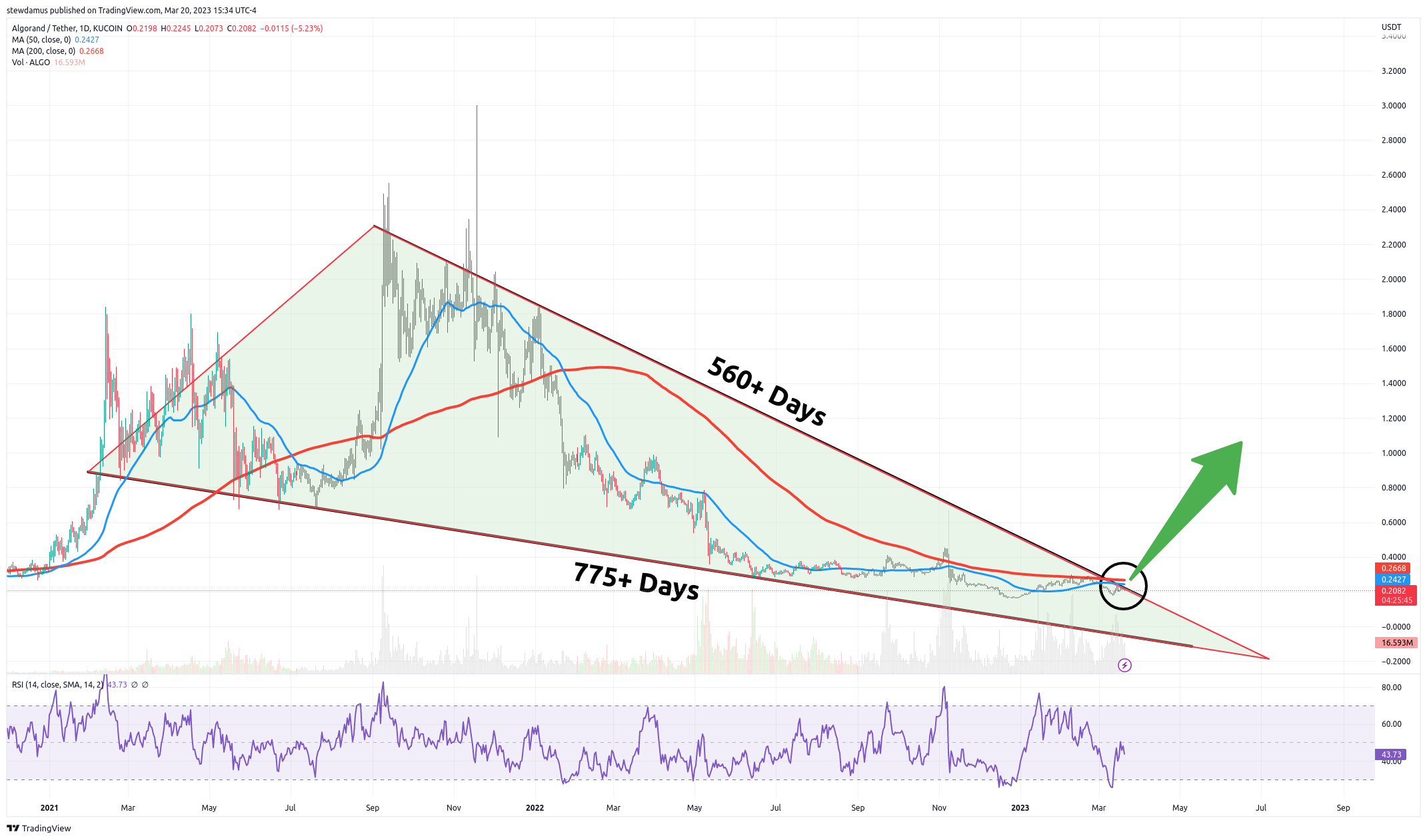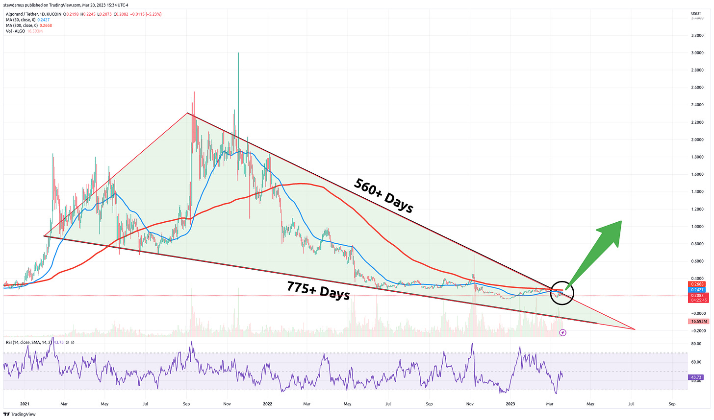 Almost Boom Time!#algorand #algo #algousd #crypto #altcoins StewdamusMar 20, 20232ShareOver 2 years to form this bullish descending wedge! I don't know which moon we're aiming for but I don't think it's in this galaxy!PreviousNext