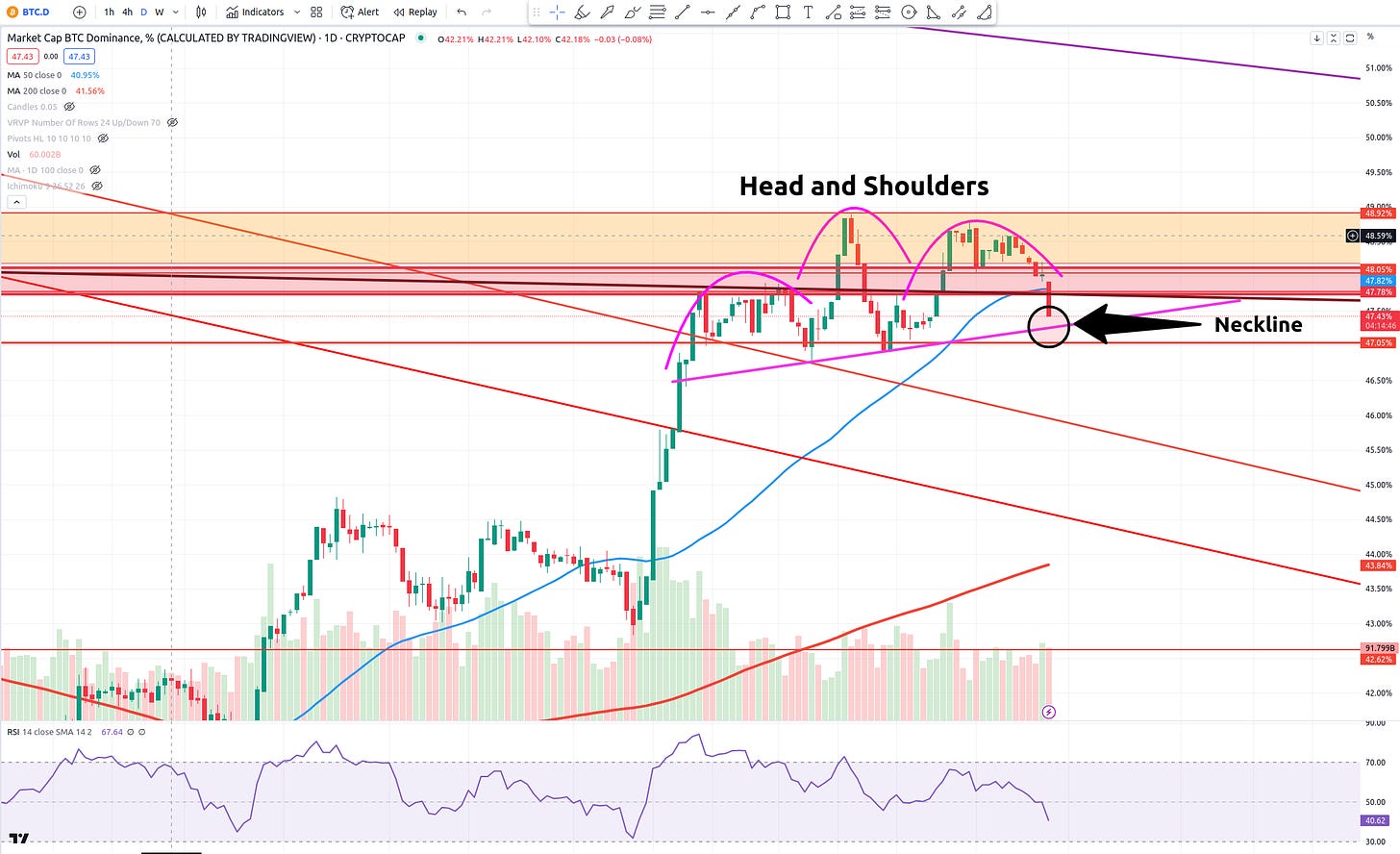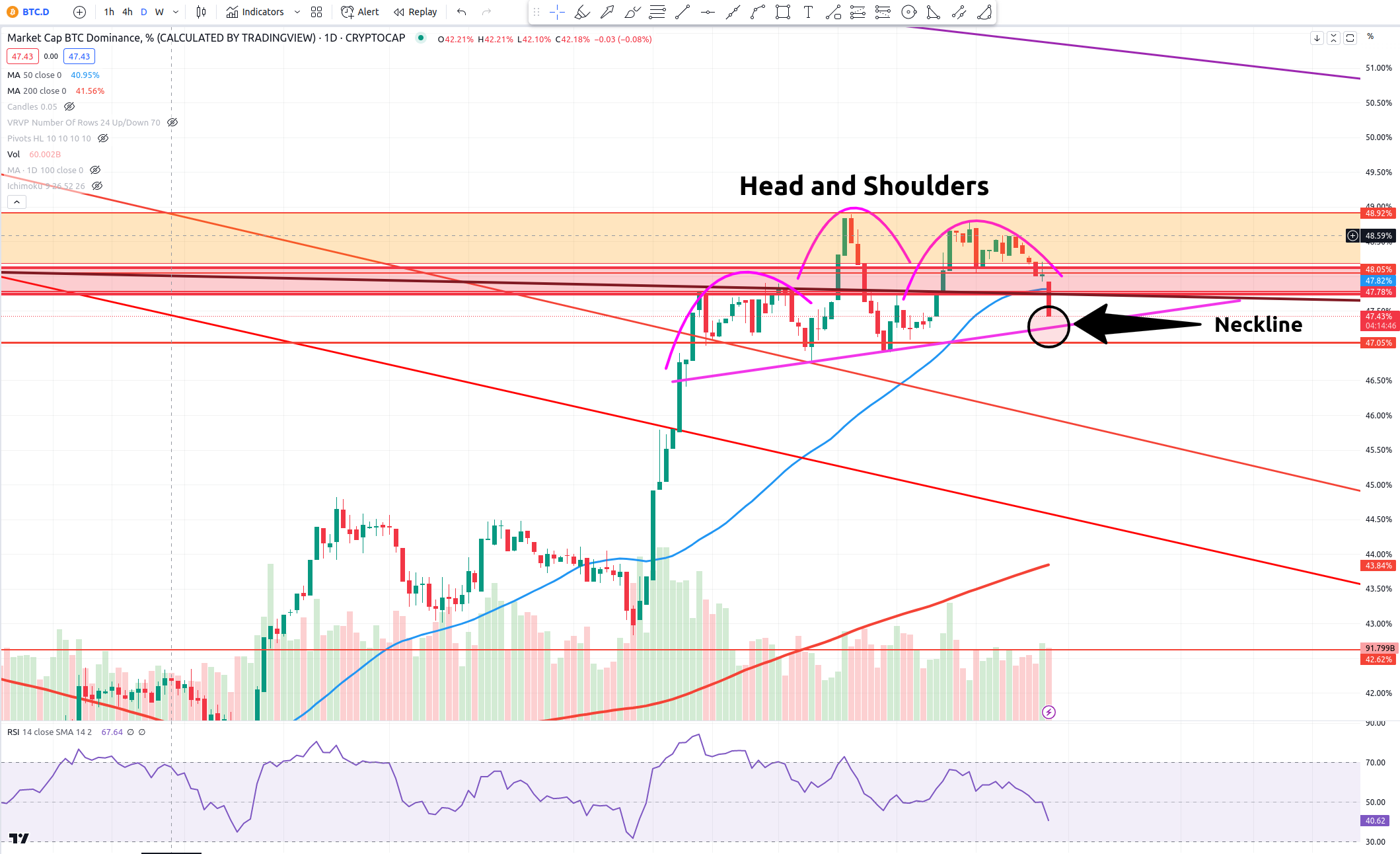 Another chart to keep a close eye on, of course, is our BTC.D (Bitcoin Dominance) chart which is currently showing a bearish Head and Shoulders pattern.