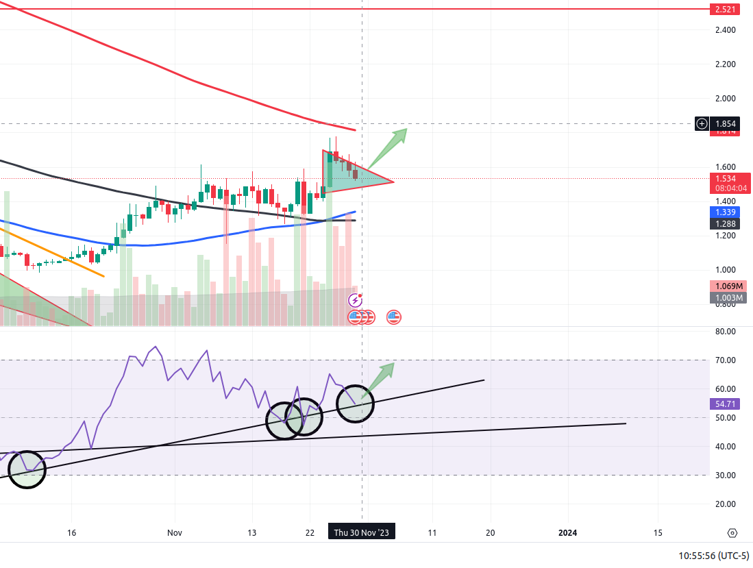Stopped out at 1.55 - 21% profit on the first 75% and nearly 10% on the remaining 25% that I trailed the stop on. Happy with this result. May re-enter as APE appears to be forming a bull flag rn and that daily RSI is back on support.