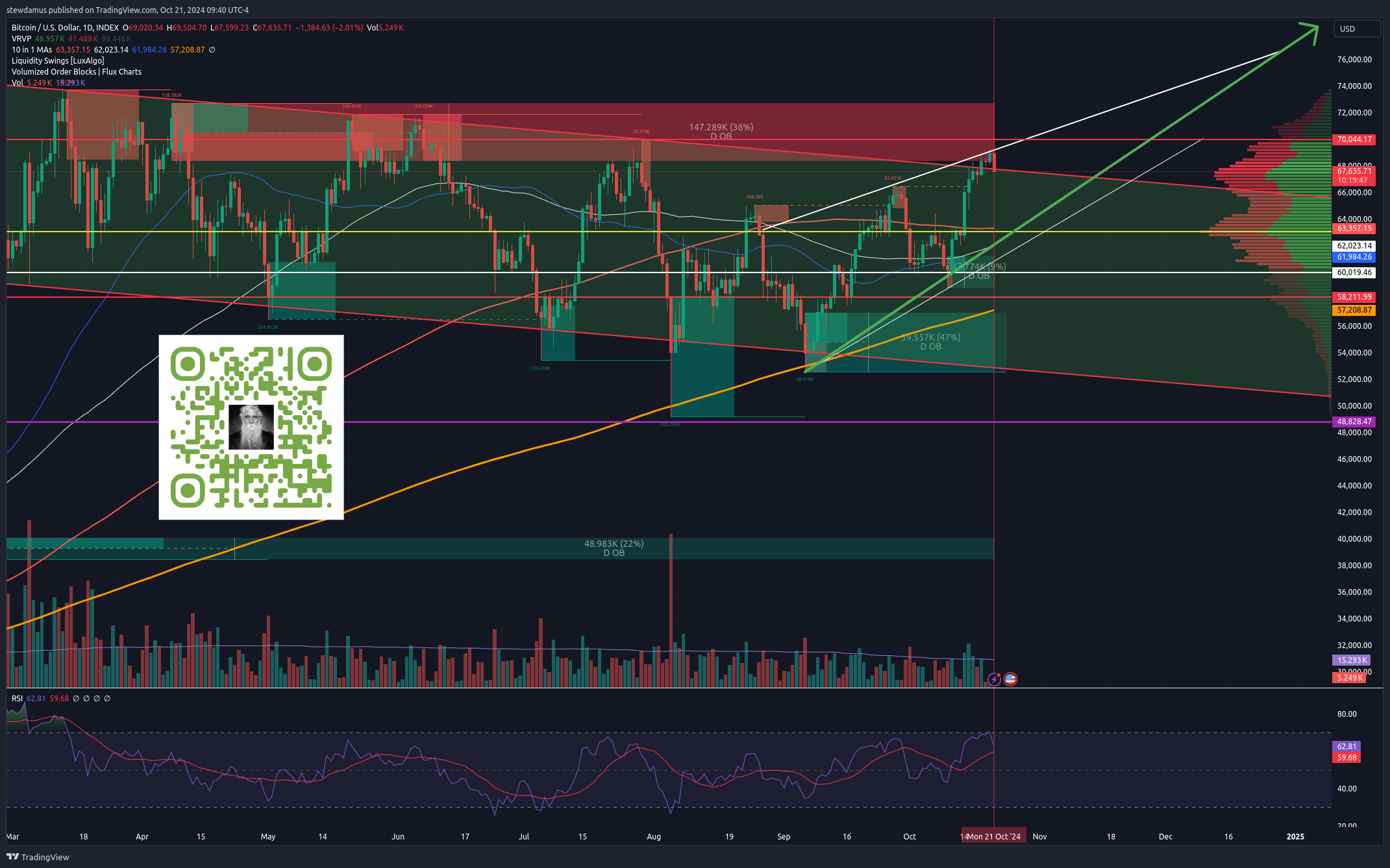 In addition to the sell signal being given and our hit of 68k, there are a few more technicals I am seeing that support the idea of selling here. You can see that big old order block above. I use two indicators that help me to determine where these buy/sell orders may be. One is by LuxAlgo called Liquidity Swings and another by Flux Charts called Volumized Order Blocks. It is this latter order block you are seeing on the chart above. This is showing me that we are running into big resistance around 70k. Two things could happen here. Either we break straight through that soon (maybe this week) and liquidate all the shorts forming a huge green candle, or we start to run sideways/down for a bit longer.