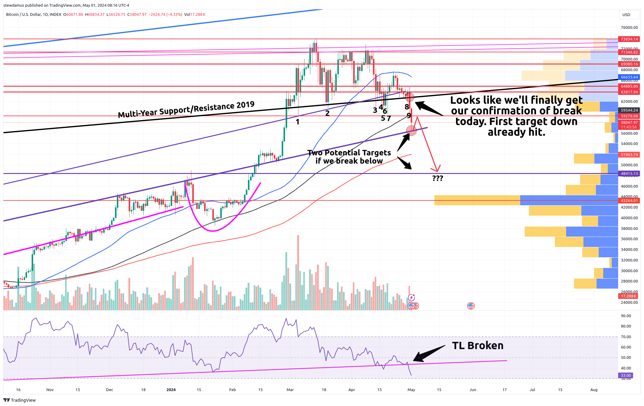 I expect a bounce from here. We are already seeing that as of this post. We should then hit our heads on 59.3k and drop again. The question becomes, will we break that first purple trendline to the downside and continue down to 48.5k.