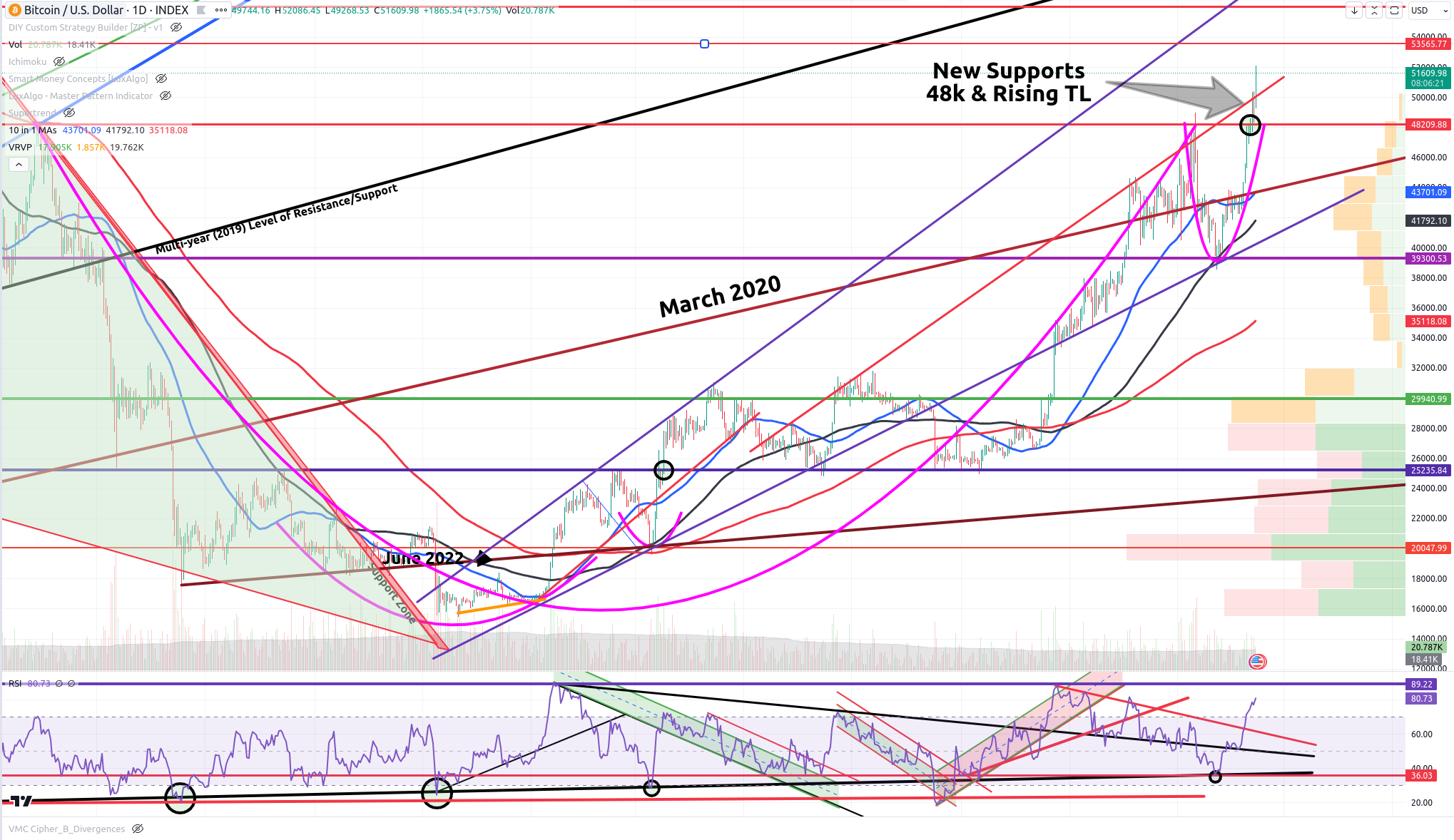 Bitcoin has crushed the 48k barrier finally. And with that we are on our way. The long-time Cup and Handle Pattern that I have been alluding to for so long is now in play and tells us that we should easily reach 80k this year and maybe as soon as mid-summer.
