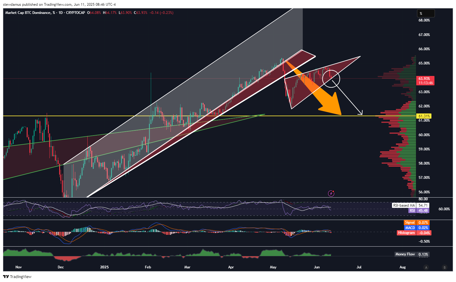 I really don't have much to say on this post. My last post on Ethereum showed us an inverse head and shoulders pattern, which plays out over 85% of the time. This is a clear sign that altcoins may rally within the next week or two. And here, on our Bitcoin dominance chart, you can see that the patterns are clear, BTC dom cannot last at this level much longer before a breakdown to 61% or lower occurs. Be prepared. FOMO will get real.