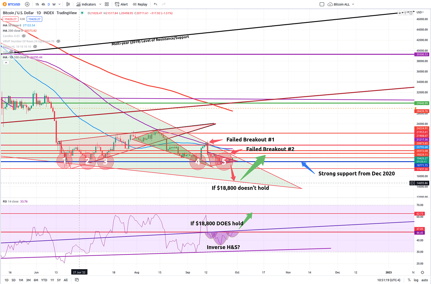 Should BTC break to the downside, I would expect it to test the bottom of our triangle one more time (currently 15k). Now, 15k does not have to be a precise price. We could wick down as low as 14k before the selling resides. But I would expect the body to close at or around 15-16k on the daily when it's all said and done at which point we rebound and finally break out to the upside of our long-standing descending wedge.