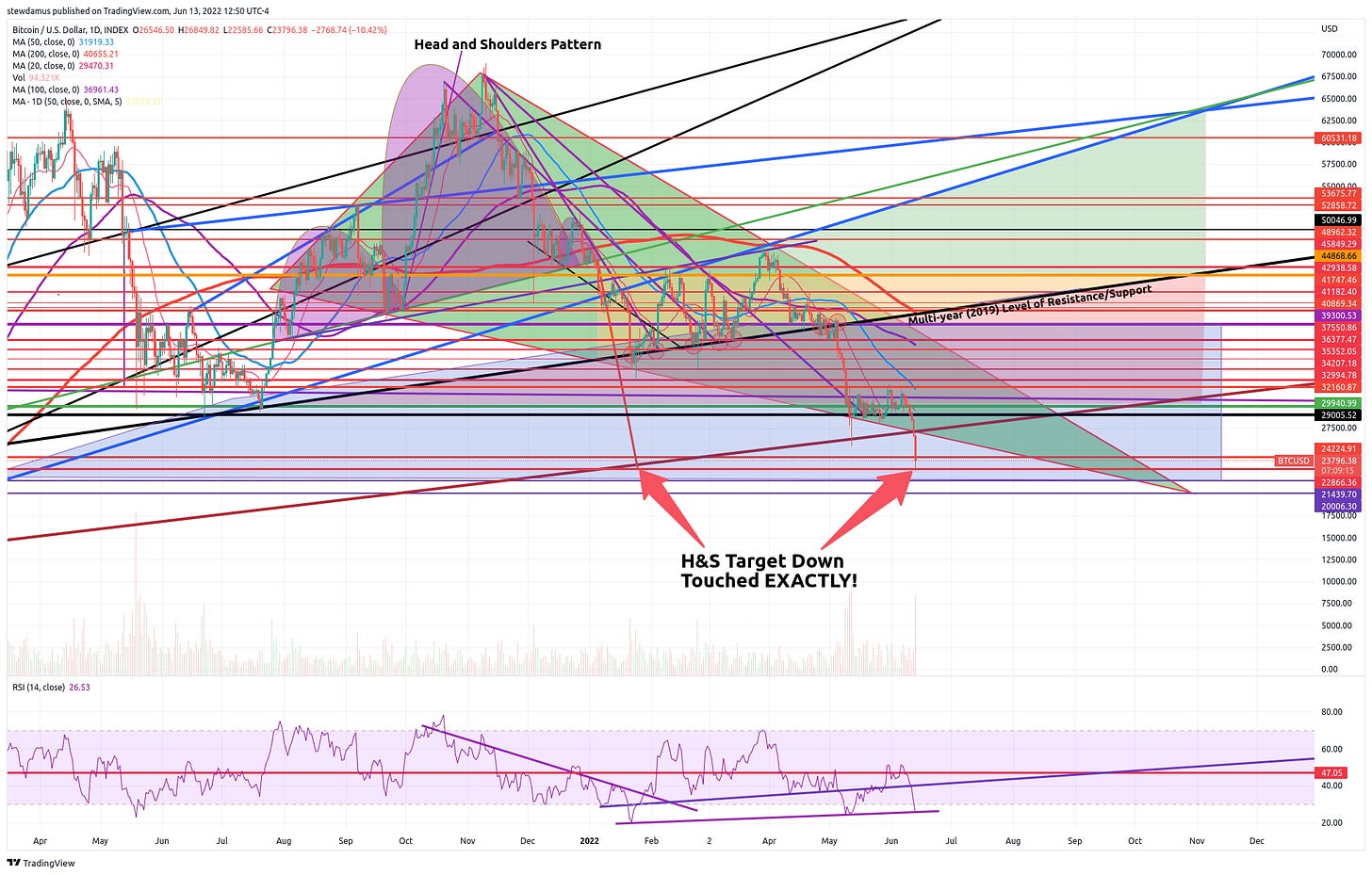 With absolutely amazing technical precision, Bitcoin has now touched our target down for the Head-and-Shoulders pattern I drew in the fall of last year! This is all I wanted to show you. Take it for what it's worth. I am not going to make predictions based on this. At this point, I am tired of making predictions and being wrong. I doubted all along that the H&S pattern would play out. It did. And here we are. This is why I love technical analysis! If this whole bear market has taught me anything, it's this: Throw out all the hype. Throw out all the bias. Put all the noise aside. As one of my paid subs did, even unsubscribe from YT influencers. Get rid of all the hype and focus on the charts. What are the charts telling you? Learn from my mistake this past fall when I ignored the blatantly obvious H&S pattern because bullish bias was so strong, etc.,etc. The charts are almost always right. And if they are wrong? Chances are we are missing something they are trying to tell us.