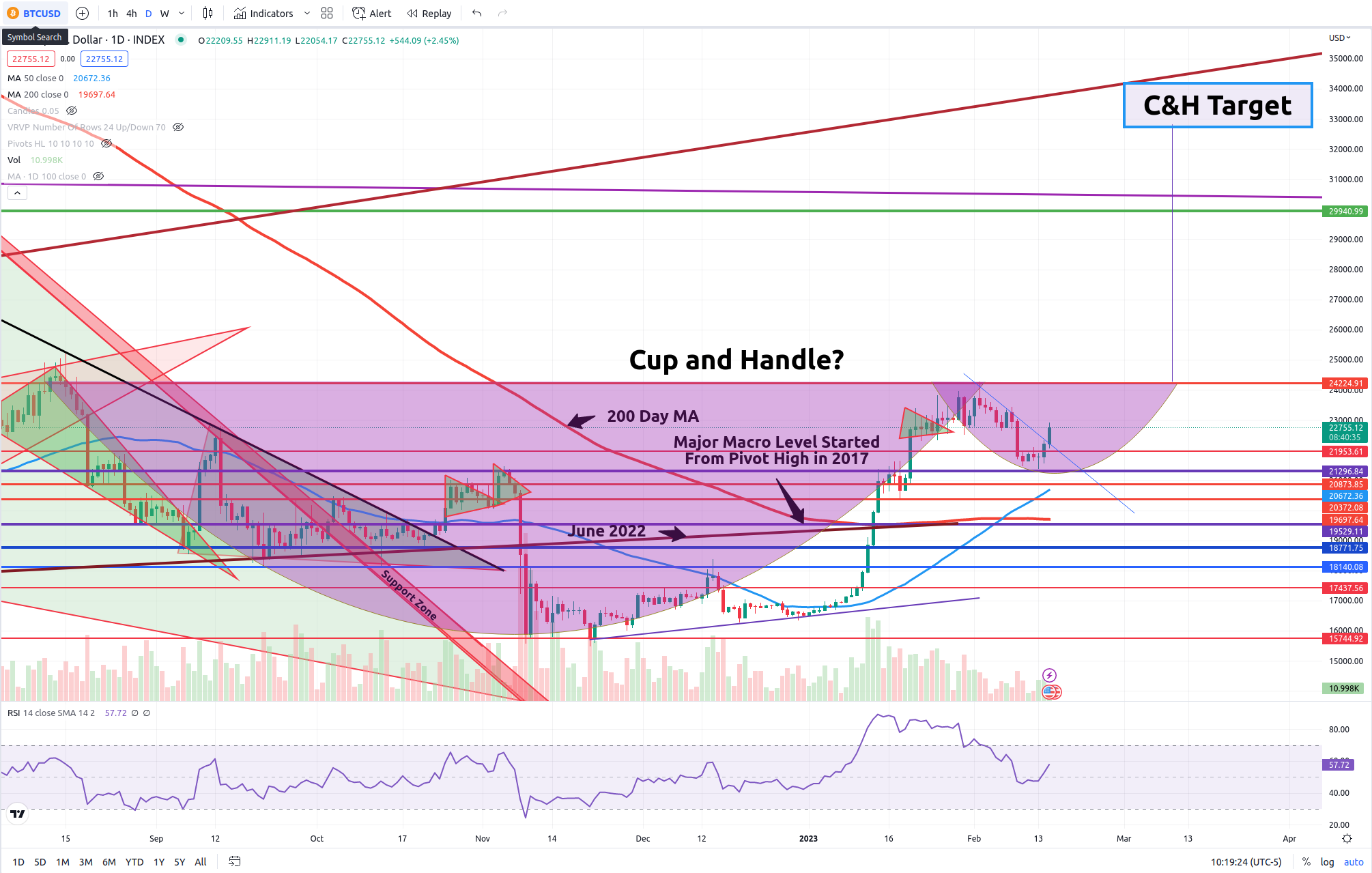 My anticipated Cup and Handle pattern looks, indeed, to be forming. The question remains on whether it will play out or not. If bulls are able to break that neckline at $24,200 then, over the next few weeks to months, I do expect them to continue to pull Bitcoin towards that target of 33-35k. Seems hard to believe I know but this is what the technicals on the chart are showing. Watch closely and trade accordingly. I will begin regularly trading again should we break that handle neckline.