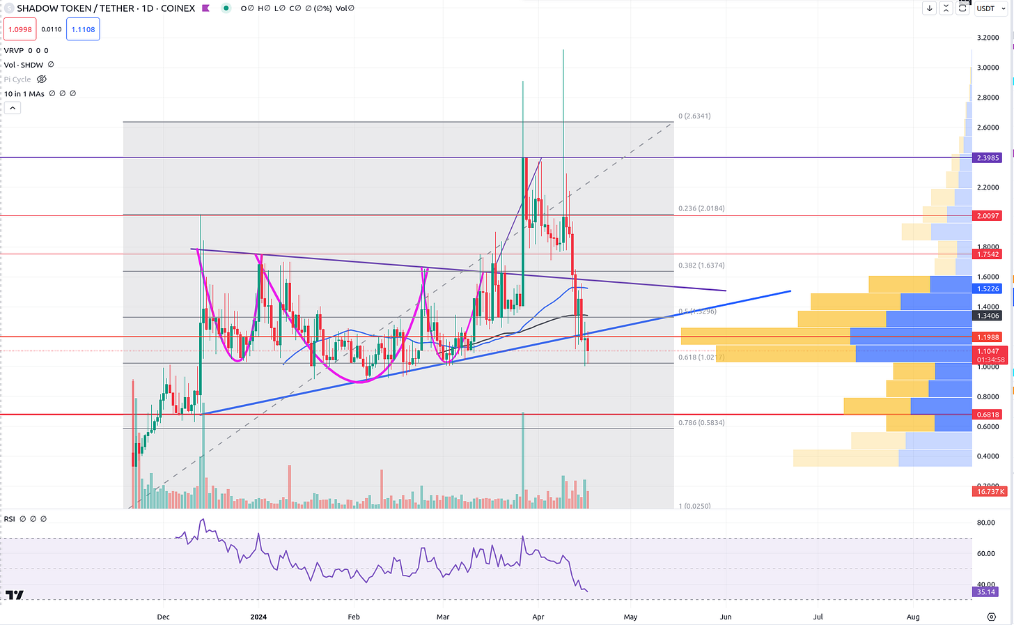 Just want to keep you up to date on important Bitcoin price action. As of today, we have broken my all-important trendline. If you’ll remember, I said that once we do this I will look to start offloading risks. Thus, I sold my degen play BAG (which actually did fairly well at holding its own during this plunge) and I sold SHDW (more below). I will be back to both of these in the future I am sure, but for now, I’ll stop playing with fire.