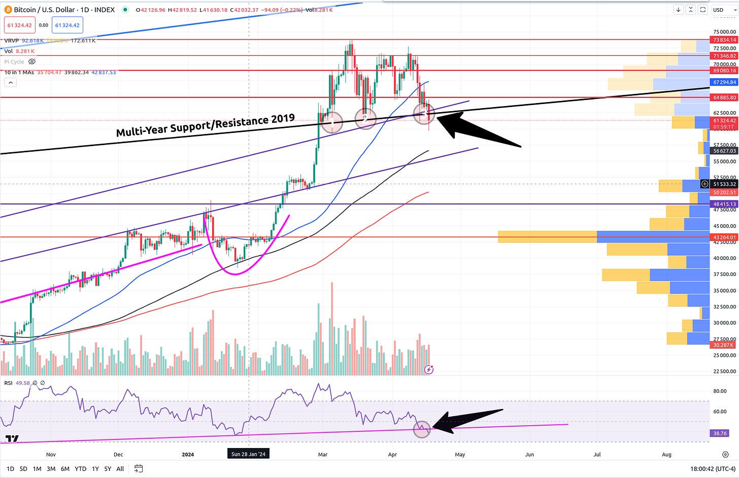 BTC has not confirmed its breakdown as of this post. We have 2 hours to close on this candle and then all day tomorrow. So, this could be a head fake but there are a few reasons why I don’t think it is.