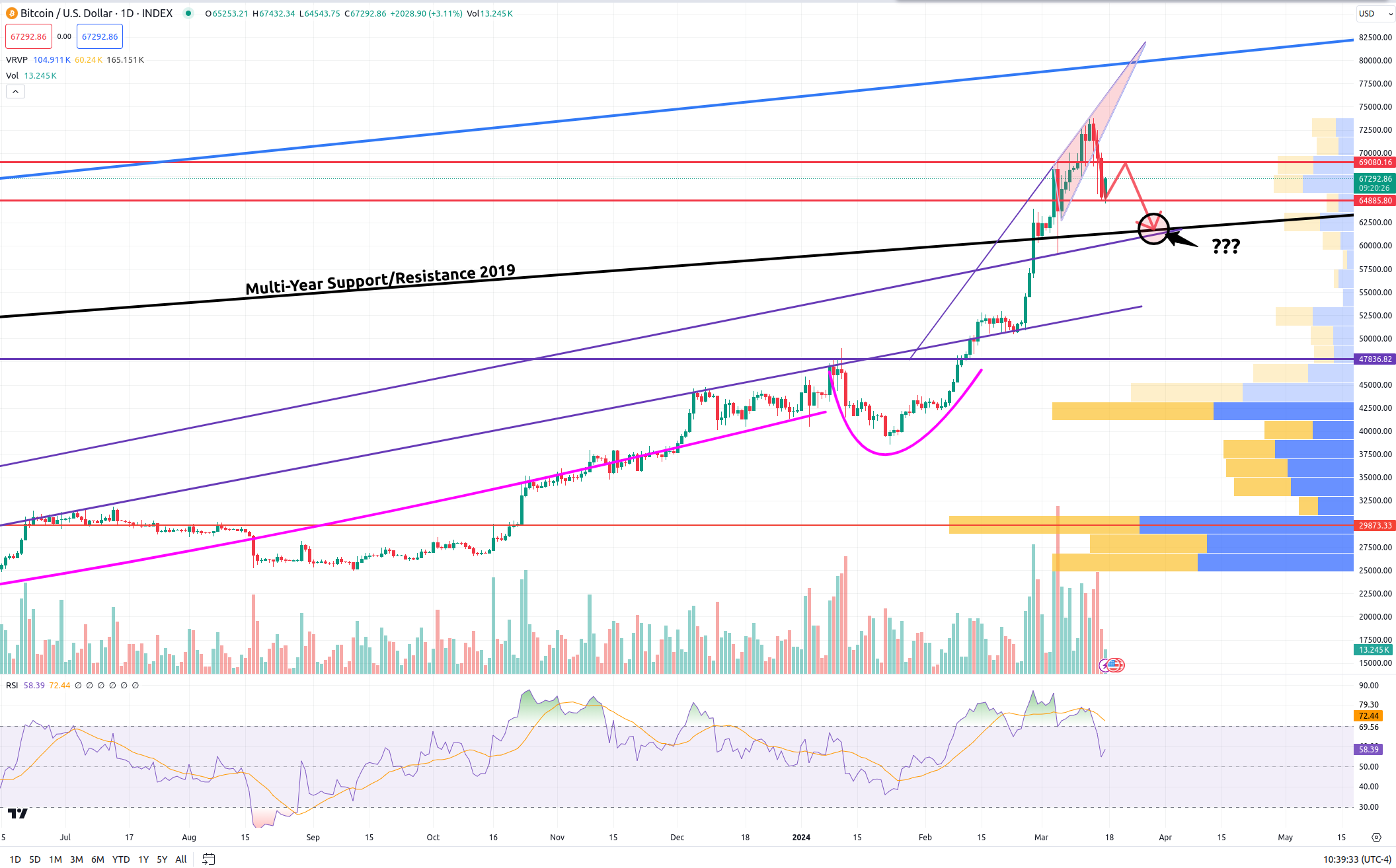 Bitcoin is likely to start making daily lower highs this next week. Of course, we have another FOMC meeting coming up which will add a level of uncertainty and possible volatility. I have been hoping for a retrace down to that 60k level (ascending multi-year support/resistance) and I think we'll get it.