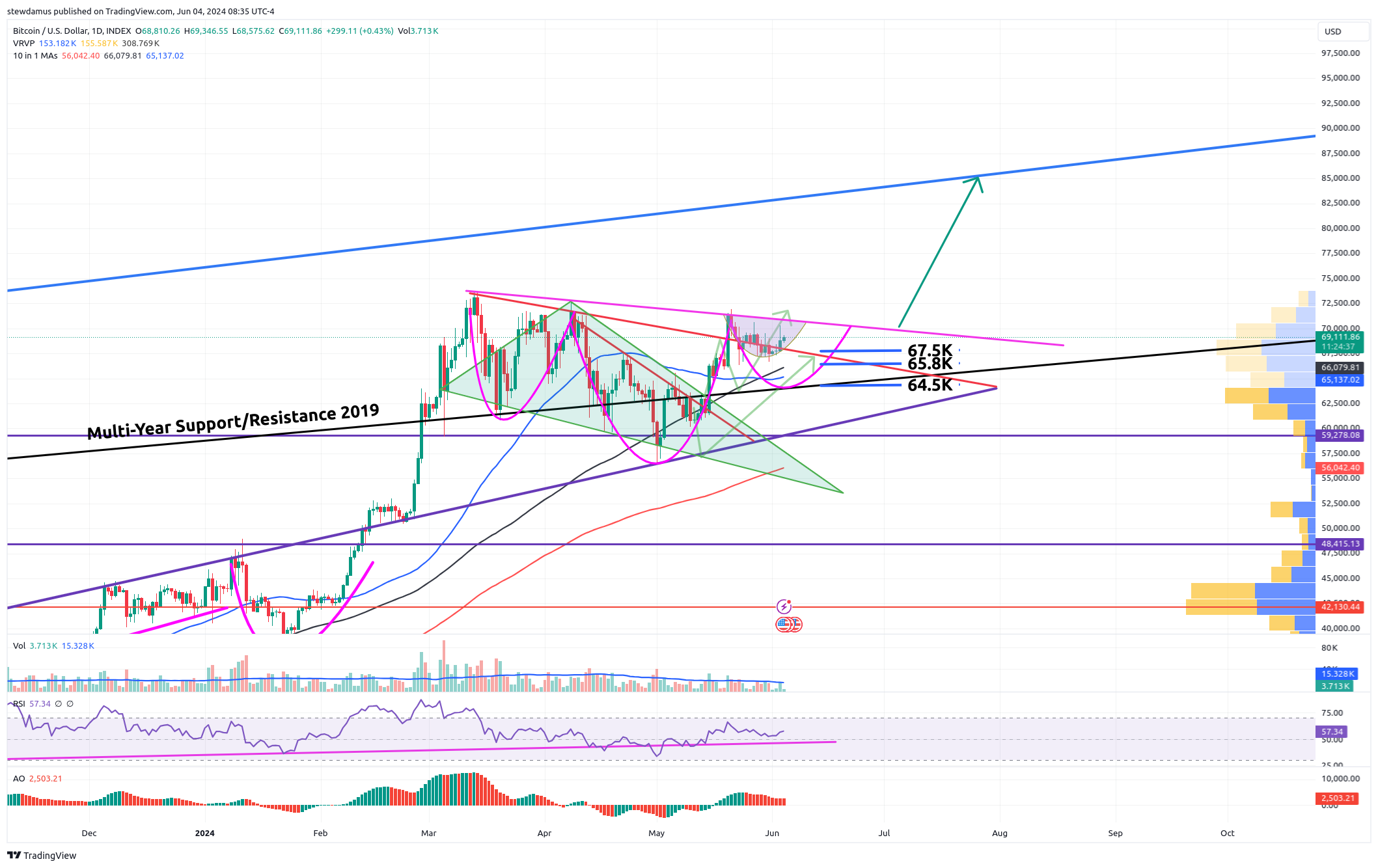 When I initially spotted what I thought could turn into an inverse head and shoulders on Bitcoin, we were at the neckline. I drew in pink what I proposed could turn into this inverse h&s with supports all the way down to 64.5k to remain valid. I am happy to see that the right shoulder appears to be forming faster than anticipated and our accumulation time appears to be nearing an end. Once the neckline is broken to the upside on this pattern, our target will be that blue ascending trend line overhead which comes all the way from Jan. '22.