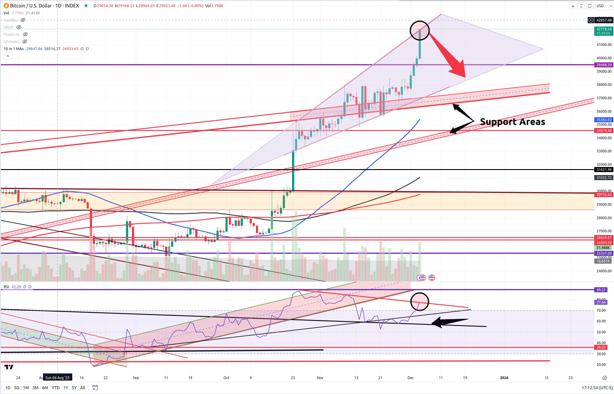 Coinciding with the BTC.D chart I posted earlier is this chart on Bitcoin. It is hitting resistance as I type this on that megaphone pattern. Could this be broken to the upside? Yes. But what supports the idea that it won't is not only that bearish megaphone pattern but also the fact that we are also hitting resistance on that RSI chart. Now, pair that with the BTC dominance chart showing us a potential double-top on dominance and I feel that the greatest probability for Bitcoin over the next few days/weeks is sideways to down.