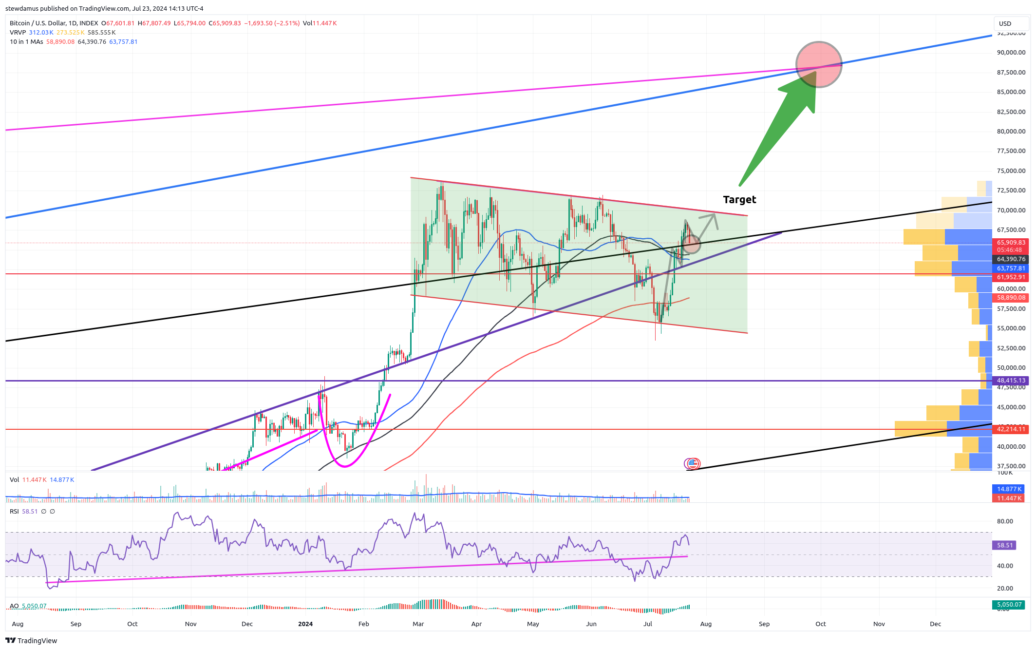 Bitcoin is back on our trusty multi-year support from 2019. I expect a bounce off of this either tomorrow or Thursday. This will likely propel us upward to test the underside of our channel. Once we break that to the upside, our target will approach quickly.