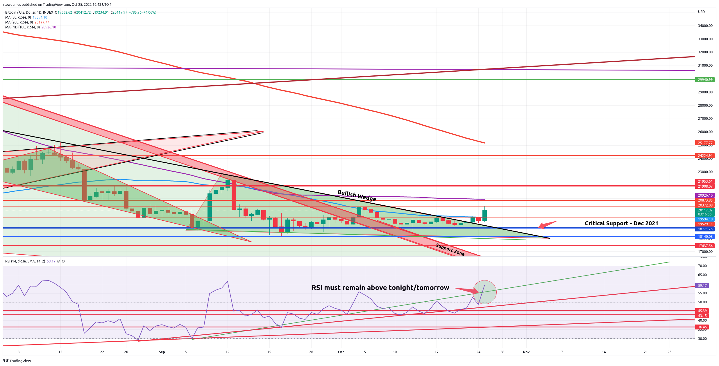 Now, if you are a follower of mine, you'll know that I entered a 5x long position at $18,300. We are at over 50% profit thus far. I've adjusted my SL once to $18,500 putting me quickly in the green for this trade even with my SL triggered. I will now be moving this up again to our critical support area of $18,700. Should we remain above our 50 day ma tomorrow, I will move it yet again to around the $19,200 level.