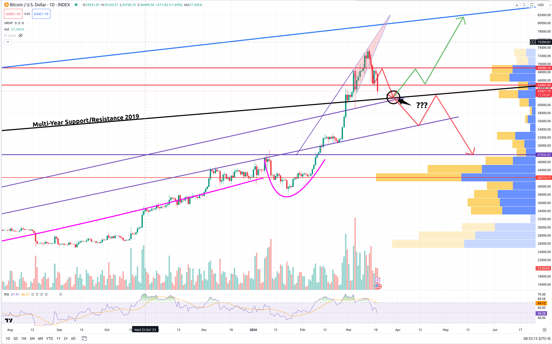 In my last post(s), I had projected a bounce from 64.8k to 69k. Check. Then, I suspected we may drop again and next break 64.8k. Check. The next target was then a retest of my multi-year support/resistance tl from 2019. We are almost there. The tl actually sits at around 61k and rising. However, we could wick down below that during the course of a day. Once at this point, I explained that the market will have to decide whether we drop further (in this case, 48k would be our next target down) or whether we rise again and move up to my inverse h&s target of 79k. My bet is still on the latter. But any break below that 2019 tl with confirmation could easily change my mind. Until then, the line in the sand has been drawn and I remain bullishly biased to 79-80k at which point I will re-assess.
