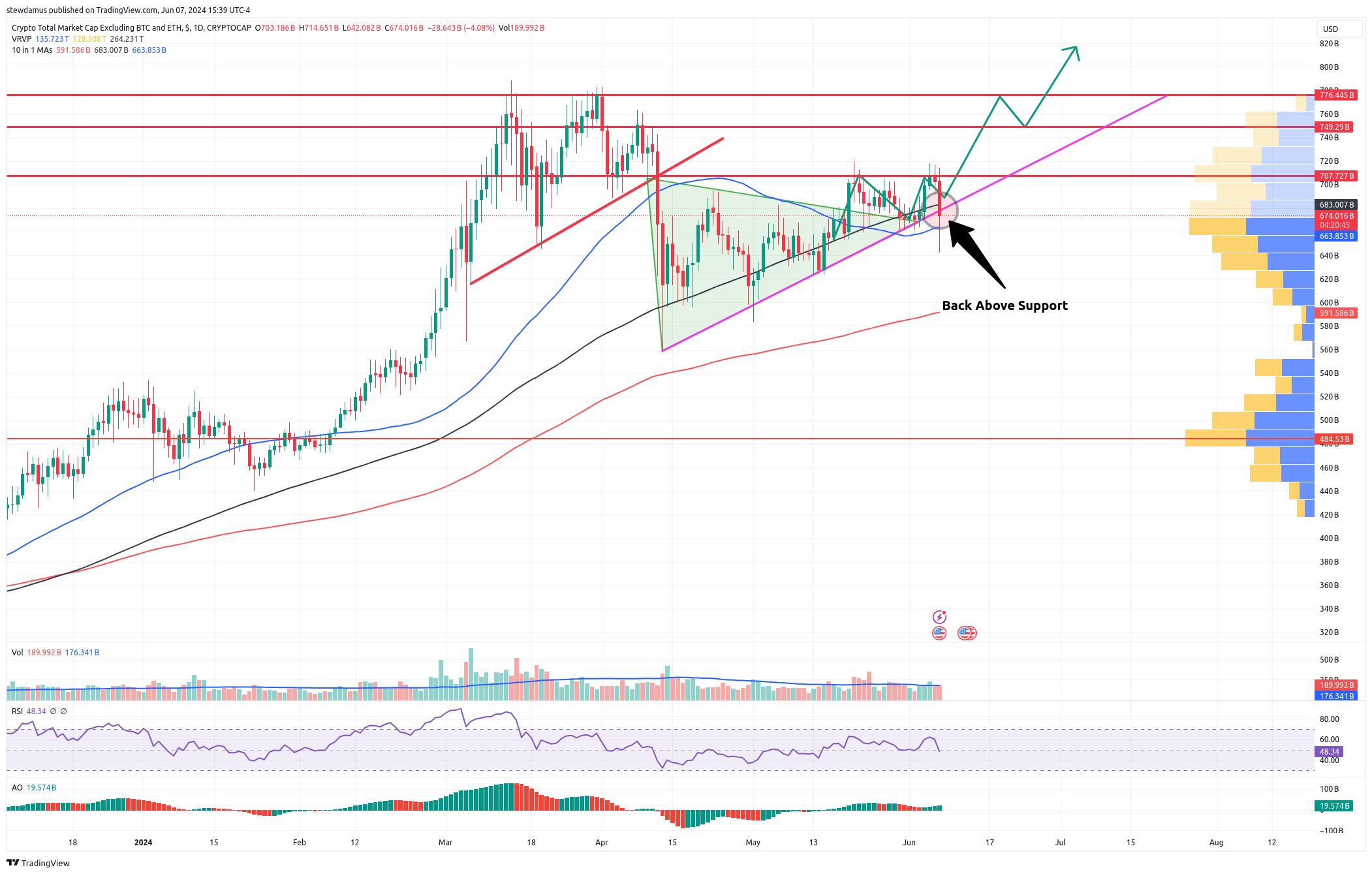 Blackrock Trading Coin will move this whole market. Market makers know this. Manipulation only has to be done at the highest level in crypto (BTC) and the rest of the market will exaggerate the movement. So, Bitcoin sneezed today and altcoins fell over, liquidating many alts. But you can see from the chart above that TOTAL3 is right back above support. This is the liquidation event that I was not looking forward to. But I have also been expecting it. Fortunately, I had stops adjusted appropriately on most trades and remained in the trade. For those that did get hit, half of them still stopped out in the profit, thanks to trailing my stops.