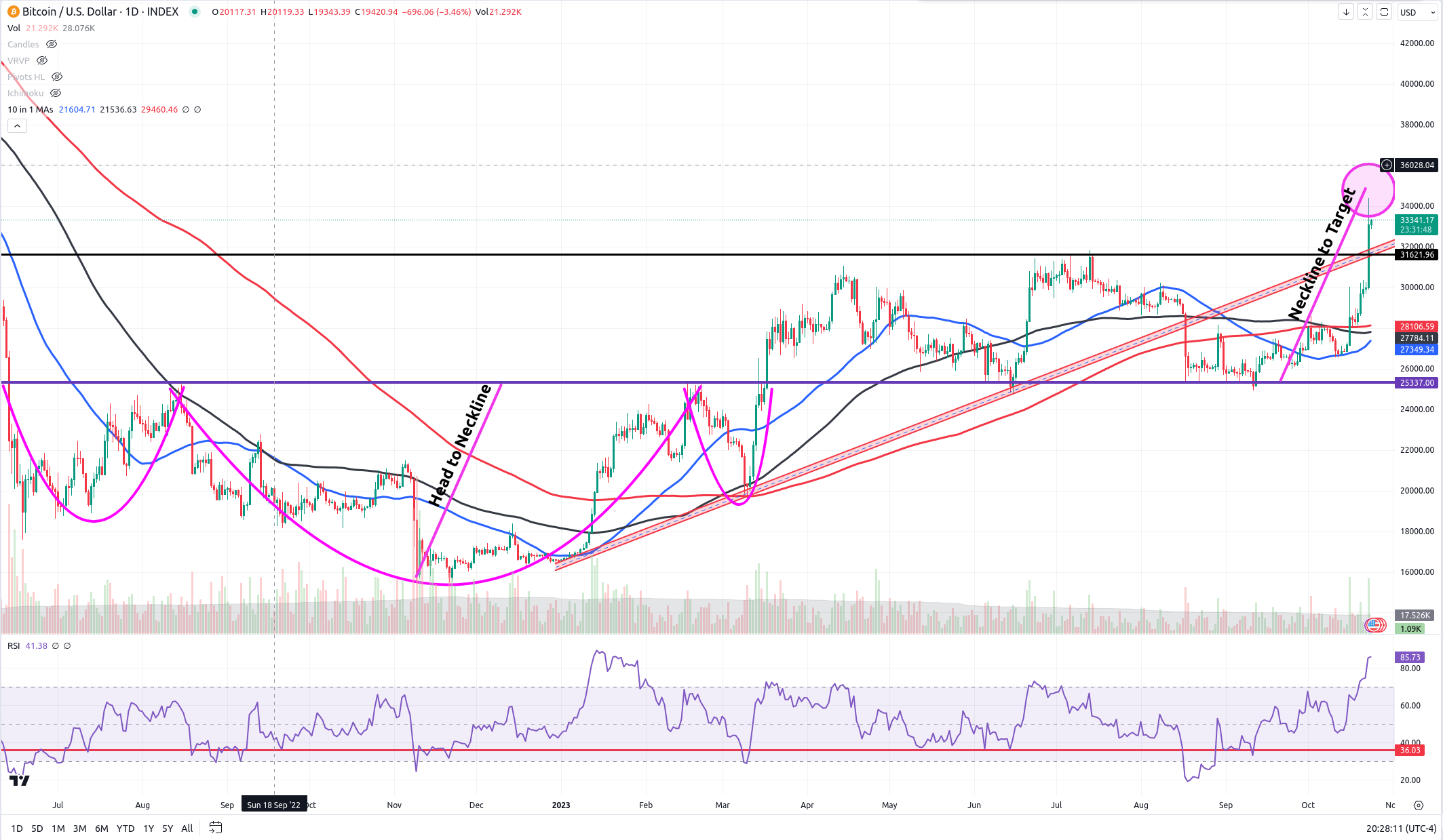 Since June of last year, we have watched the start of our inverse head and shoulders pattern begin to form and then complete in March of this year, at which time we broke above our neckline (purple) and began to take aim at our target of 35-37k. Unfortunately, Bitcoin then became rangebound. Today that range was broken. And technically, we can say that our target has finally been met. Though Bitcoin may still have some steam in the tank, it must hold above 31,600 tonight and tomorrow for me to be a believer. Should we break back down below 31,600 all bets are off. We can call this pattern complete and look for the next.