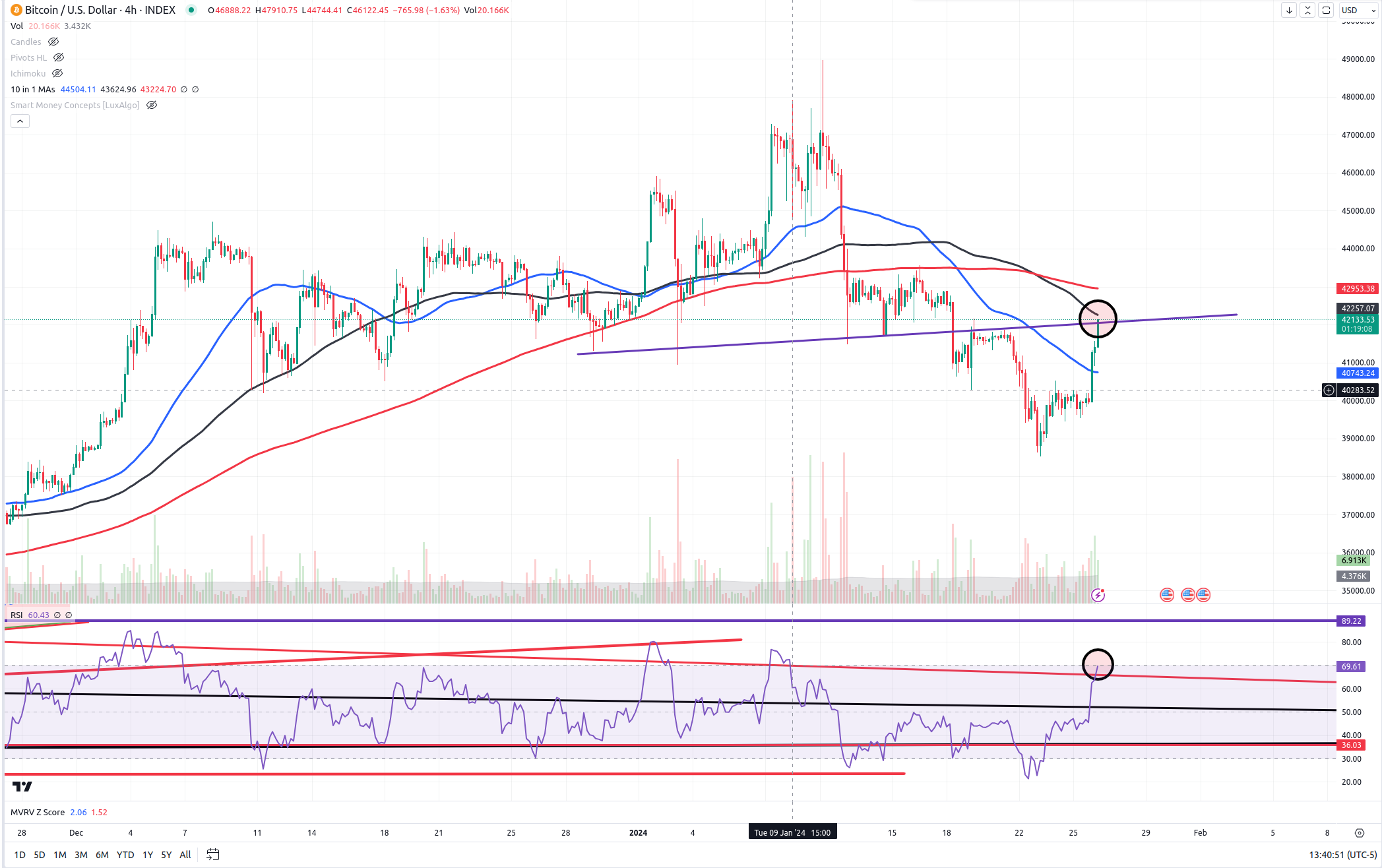 The 4 hour chart is showing resistance both on the price side and RSI. I have decided to take my Bitcoin profits here and am all out. I will look for re-entry if we drop back down to our daily supports (around 39k) OR should we confirm further movement to the upside.