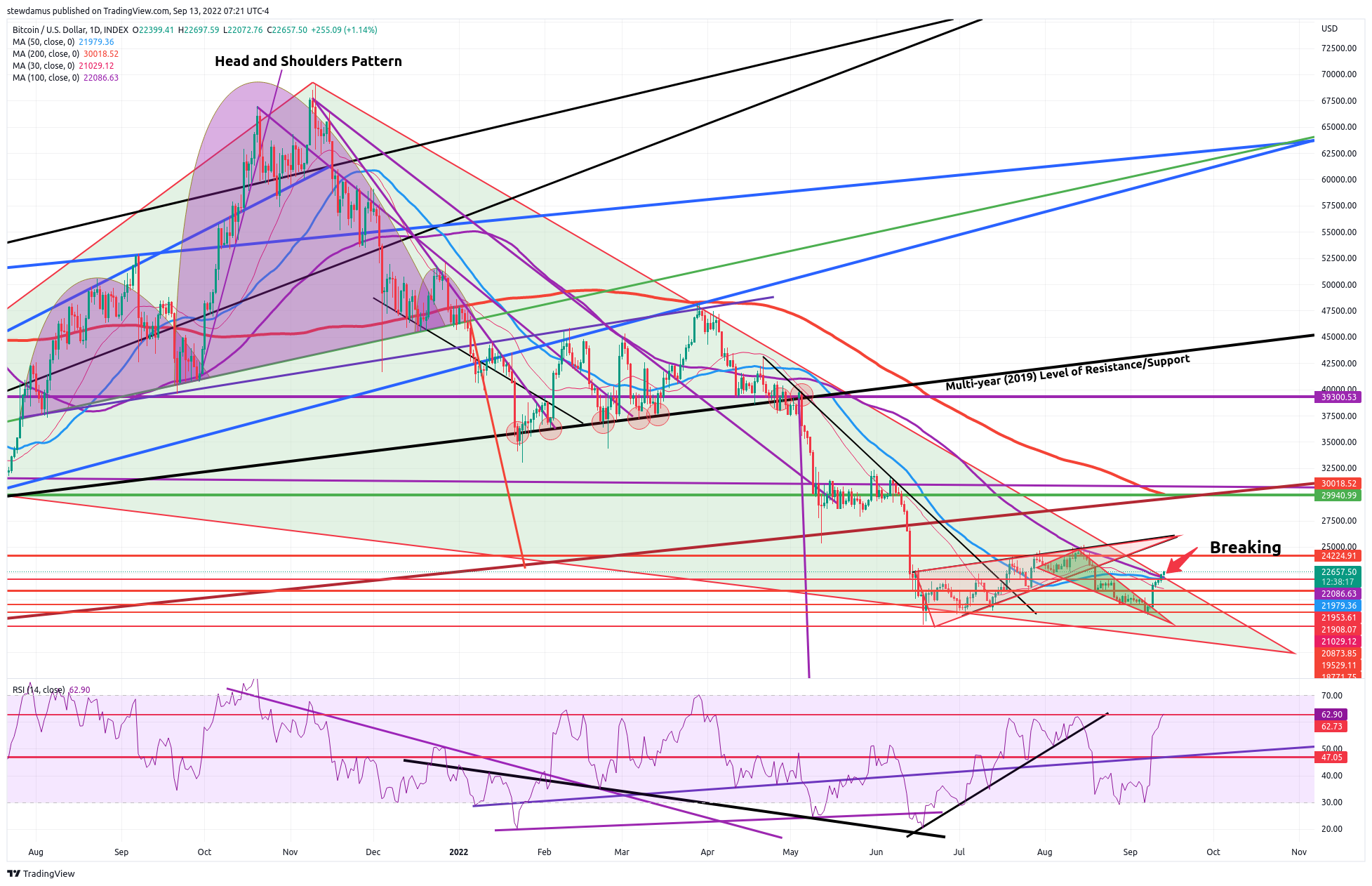 Breaking! Bitcoin going up!#bitcoin #btcusd #crypto #cryptocurrency #btc #long #breakout #tradealert #trendline #descendingwedge #pampitStewdamusSep 13, 2022ShareFor the first time since Nov. 2021, BTC is breaking to the upside of our very bullish descending wedge! Hang on traders! Shit’s about to get real!PreviousNext