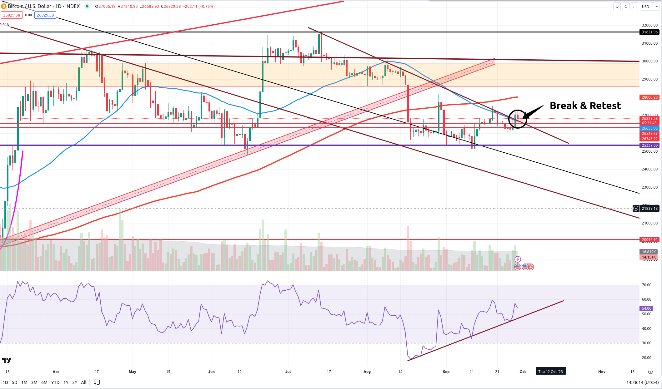 Bitcoin is now once again slightly bullishly biased. It has now absorbed the 26,300-26,500 price sufficiently and more accumulation has occurred. Additionally, we can observe a break to the upside of a descending TL and retest. Finally, the RSI is showing bullish divergence.
