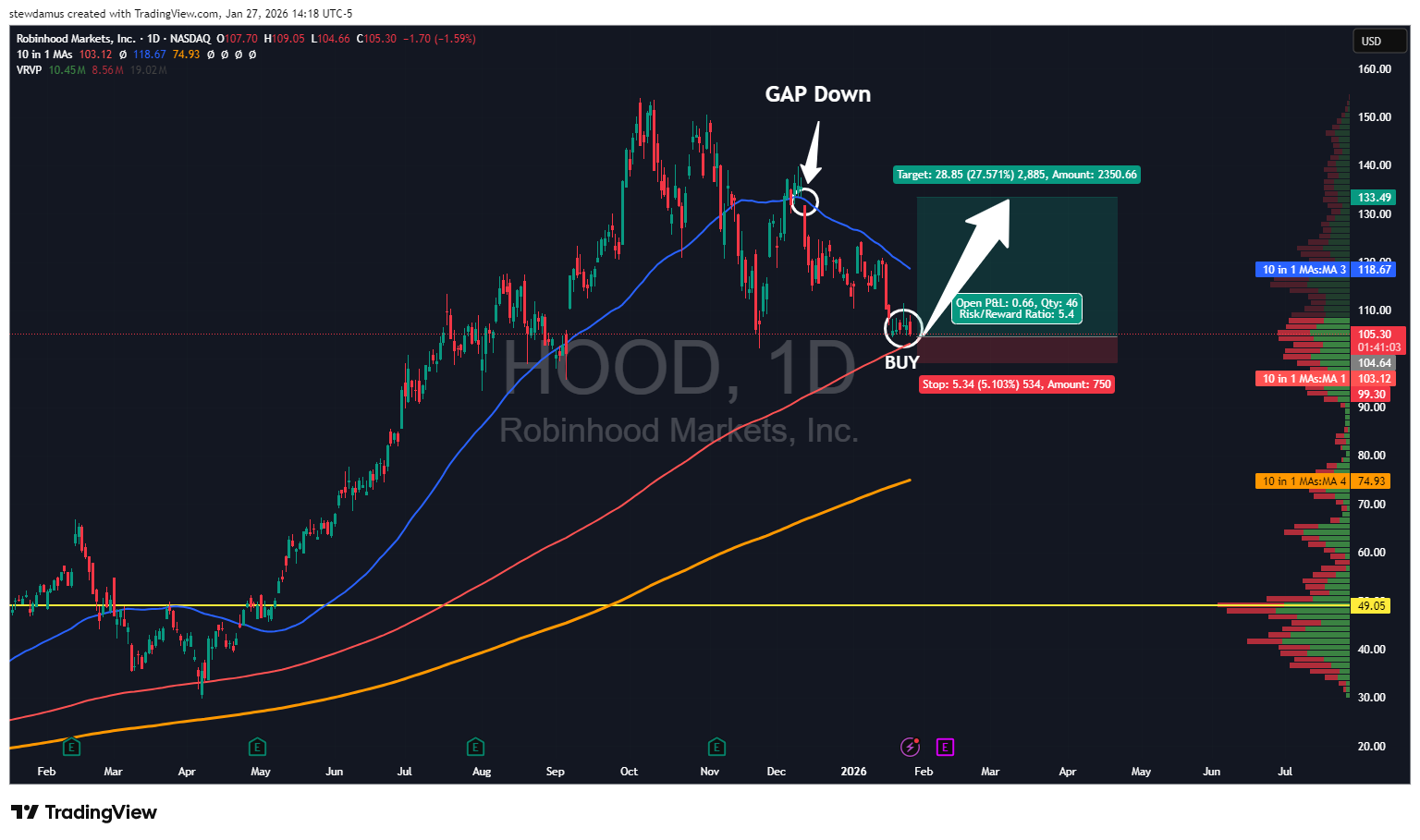 Keeping this trade simple here with low risk. Received a “BUY” signal from my [url=https://www.tradingview.com/script/HmkhMAiW-Pivot-Zones-Stewdamus/]Pivot Zones Indicator[/url] and I’m entering the trade. We are above the 200-day SMA. I want to shoot for that fairly recent gap down that was made at the end of last year as a target. I will exit if we drop much below that 200-day SMA. At entry, this trade was a 1:5.4 rrr.