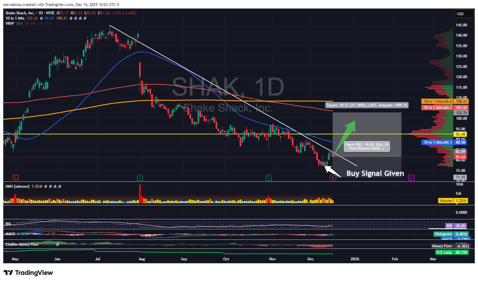 I’ve received two more clear buy signals from my indicator recently. Here on SHAK we were given our signal about a week ago. I didn’t wait for to break that descending trendline on this one, so it may be a tad bit more risky than had I waited for that breakout. However, I have full confidence in my indicator as it has a knack of predicting breakouts before they occur. I don’t doubt this will be the same.