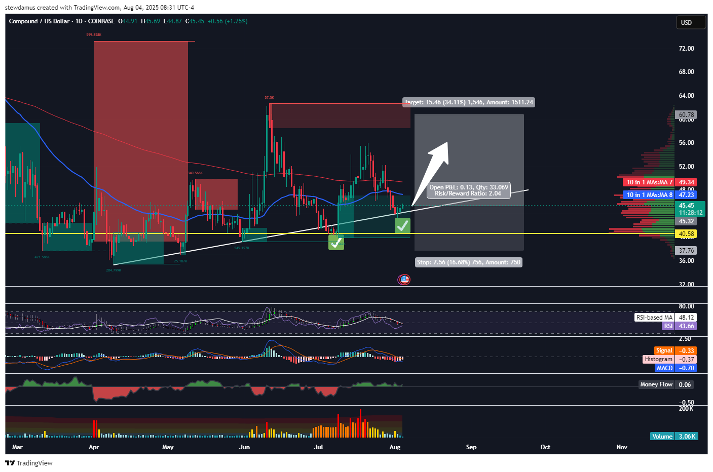 I received a BUY on FARTCOIN earlier and doubled up once again. Shortly thereafter, I received a signal on COMP here. We look to arrive on good support and are inside a beautiful block of liquidity. That is exactly where I received the signal to BUY, which I was hoping for. I'm jumping on this. Target will be around $60 with my SL set for $37.75 for a 1:2 rrr.