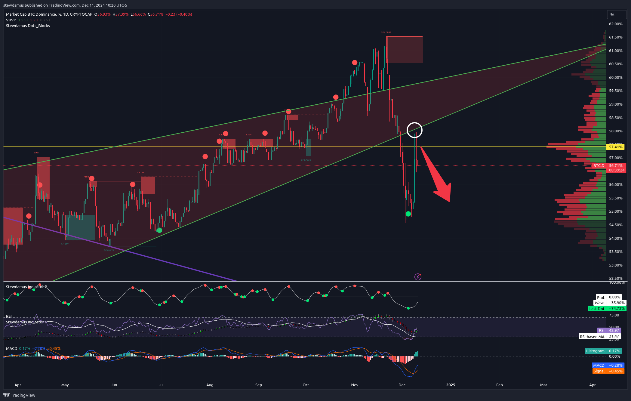 In my last post on bitcoin dominance, I noted that for the first time in a year and a half, we had broken our wedge to the downside. This was hugely bullish for altcoins and indeed, we saw some massive pumps occurring in the space. But I also cautioned that we could reverse and head back up to retest the underside of our wedge. This is a classic technical move. I call it "Kissing Mamma Good-bye" as price always seems to like to come back one more sentimental time to an area of supreme significance before moving on. This retest would then cause alts to drop significantly, liquidating many. And we saw this occur this past week. So, can we consider this our retest? I know we didn't touch the underside of our wedge completely but bulls are in a hurry here. They want one last good pump before Christmas. And if my chart is correct, I think we'll get that.