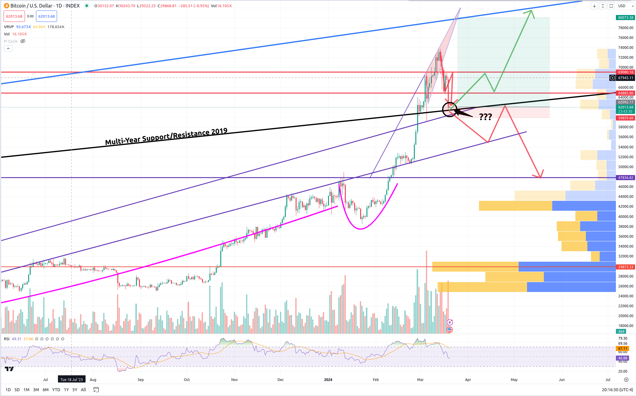 That said, I expect at least a bounce here. And I am going to play that bounce with a tight stop. I'm long BTC with an entry of just over 61k and a final target of 79-80k. Tight stop of 59,850 which turns the RRR into an 8-to1 ratio (keep in mind, selling may continue).