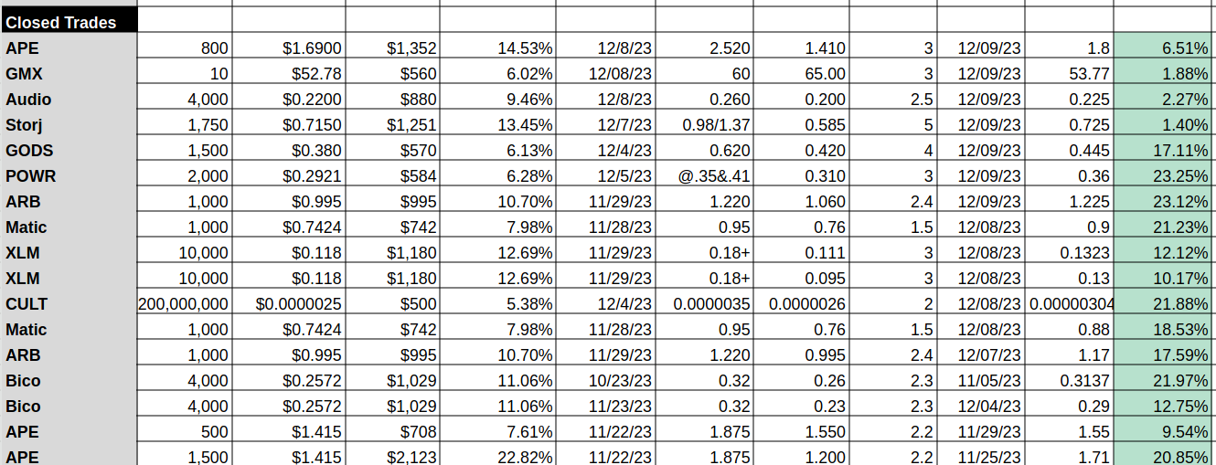 Traders, I’ve made a last minute decision to pull out of these trades not wanting to take a loss. As I mentioned in this post a few minutes ago, I am expecting a bit of a break in the altcoin space. I was slightly in the profits on all of these coins: Storj, Audio, GMX, and APE from my entry, therefore, I’ve decided to capture profits while I can and not take any loss here. Stats can be viewed on my spreadsheet below: