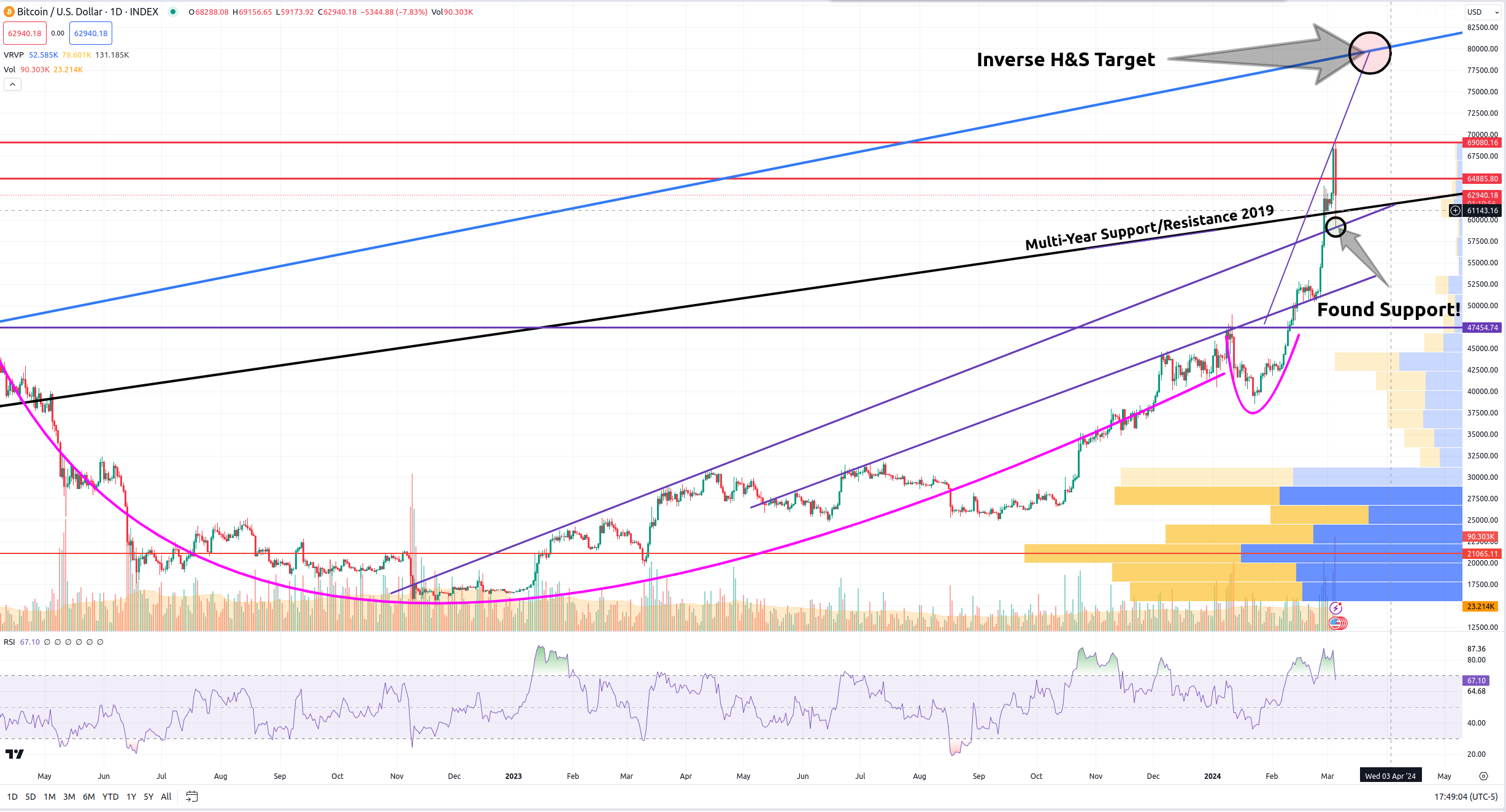 I suspect when all the dust settles and price closes out this candle we may even be back above that 64.8k support. But if we're not and we settle anywhere above my multi-year line of support, I remain bullishly biased and expect us to hit our inverse H&S target of 79k soon.