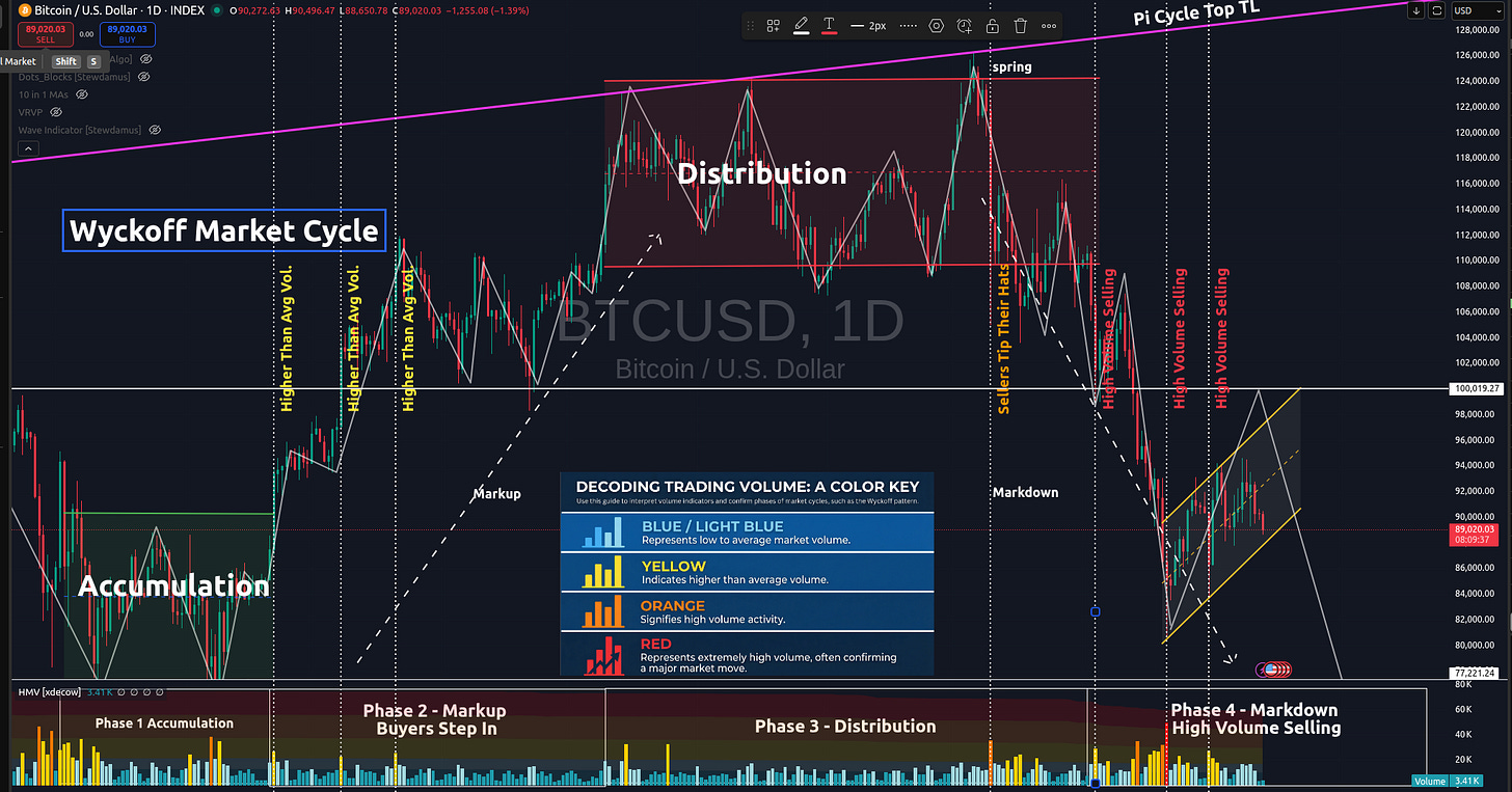 You will see each phase of the Wyckoff Market Cycle pattern confirmed by this volume on our current Bitcoin chart.
