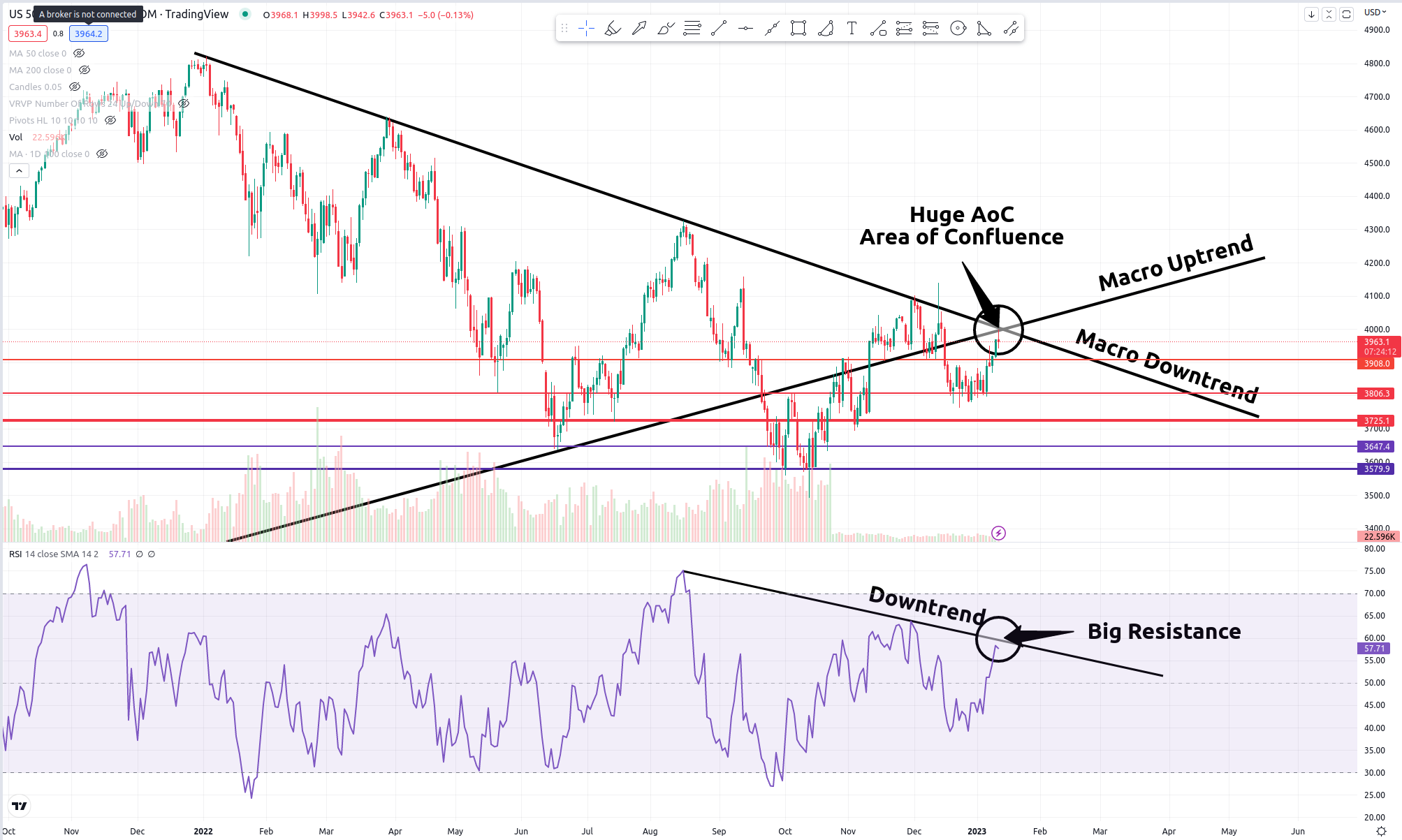 CPI at 6.5%. In line with expectations. Market remains rather neutral. Which means the news will probably not be a big enough kick to get us to the topside of major resistance on the charts. Unless/until JPOW & Co. actually pivot, either via language or actions, the market is likely to continue its current price action underneath our downtrend resistance.