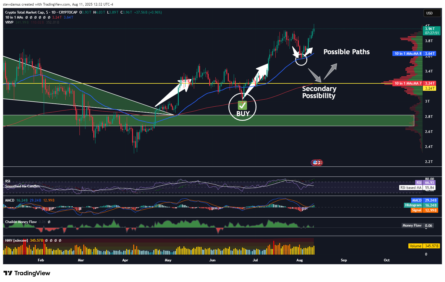 A few weeks ago, I also posted potential price paths for the total market cap, indicating two, but with my bias being towards the first. Indeed, the first path played out, exactly as anticipated, indicating a full send is currently active in the crypto space! Higher we’ll go. Much higher.