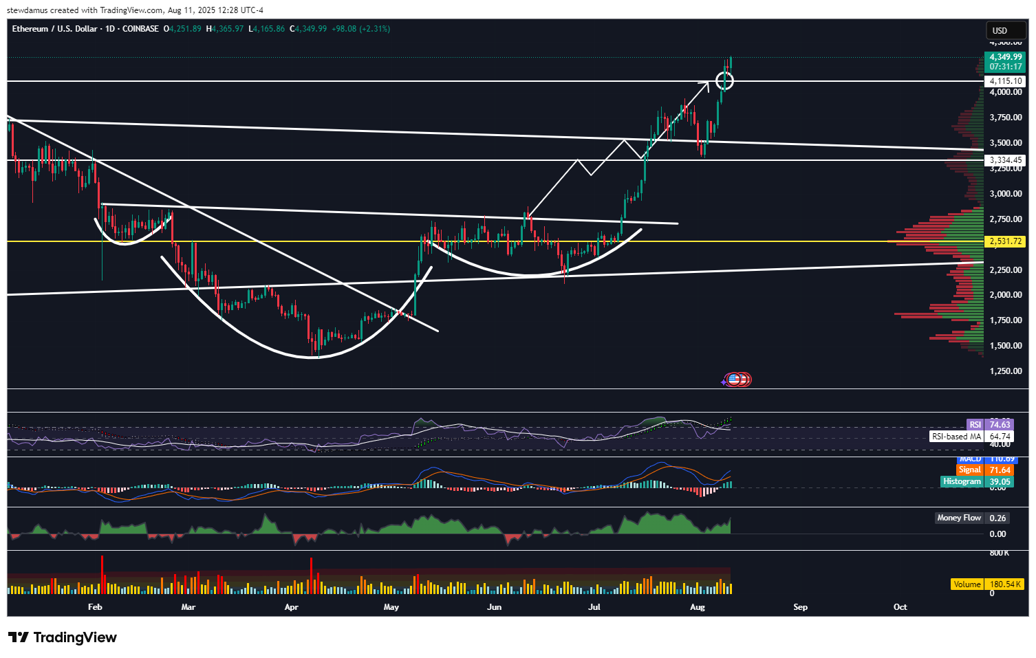 Ethereum helps to confirm my thesis here as it not only has reached my $4100 price target, but has broken through to the upside, exceeding this target. The $4100 level is now being used as support.