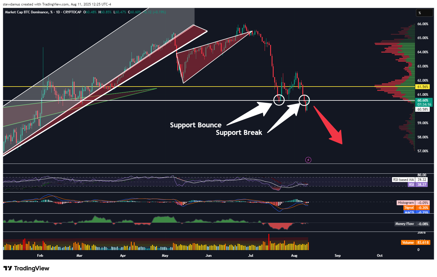 On the BTC.D chart, you can see Bitcoin dominance bounced off of that critical support as anticipated. You will now see that it has broken support to the downside with confirmation on the daily. This officially (imo) signals the beginning of altcoin season! You heard it here first. Alts should continue to run through the year-end, if not longer.