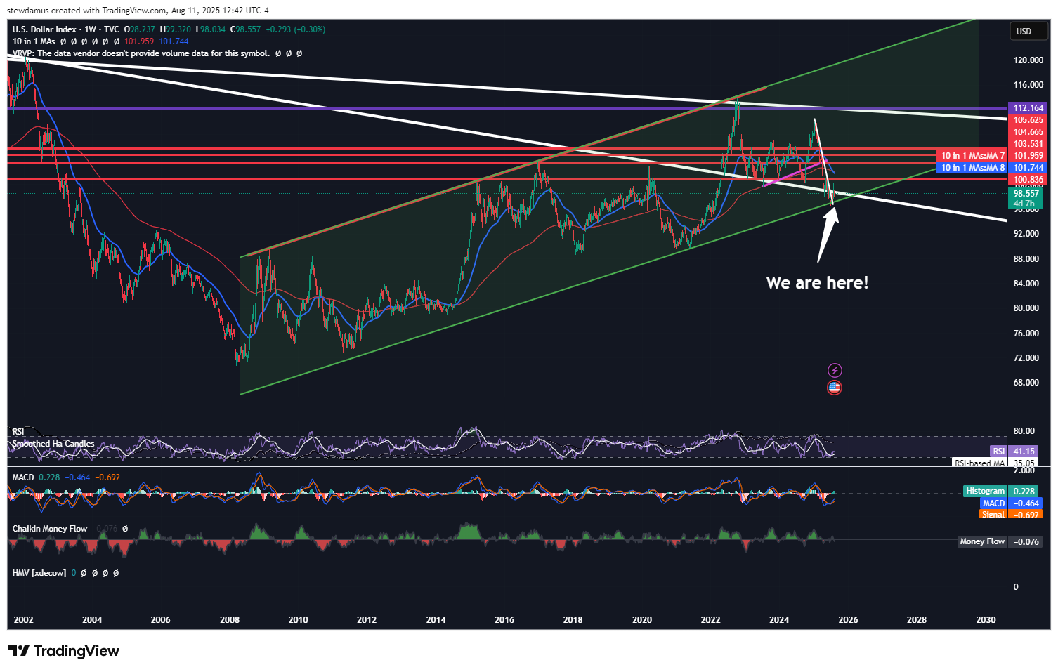 The U.S. dollar continues to show weakness and is hovering at the bottom of a long 15-year channel (see chart below). We hit the bottom once and bounced, but the bounce was underwhelming. We broke to the upside of a descending trendline, but that too was underwhelming. If we break to the downside of this channel, it is all over for the U.S. dollar. BRICS wins. Crypto wins. Precious metals will win. Commodities will win. The stock market blows the top briefly. And eventually this brings with it a great risk to hyperinflationary recession here in the U.S. If you think shit is expensive now, the U.S. dollar will be saying, “Hold my beer!”.