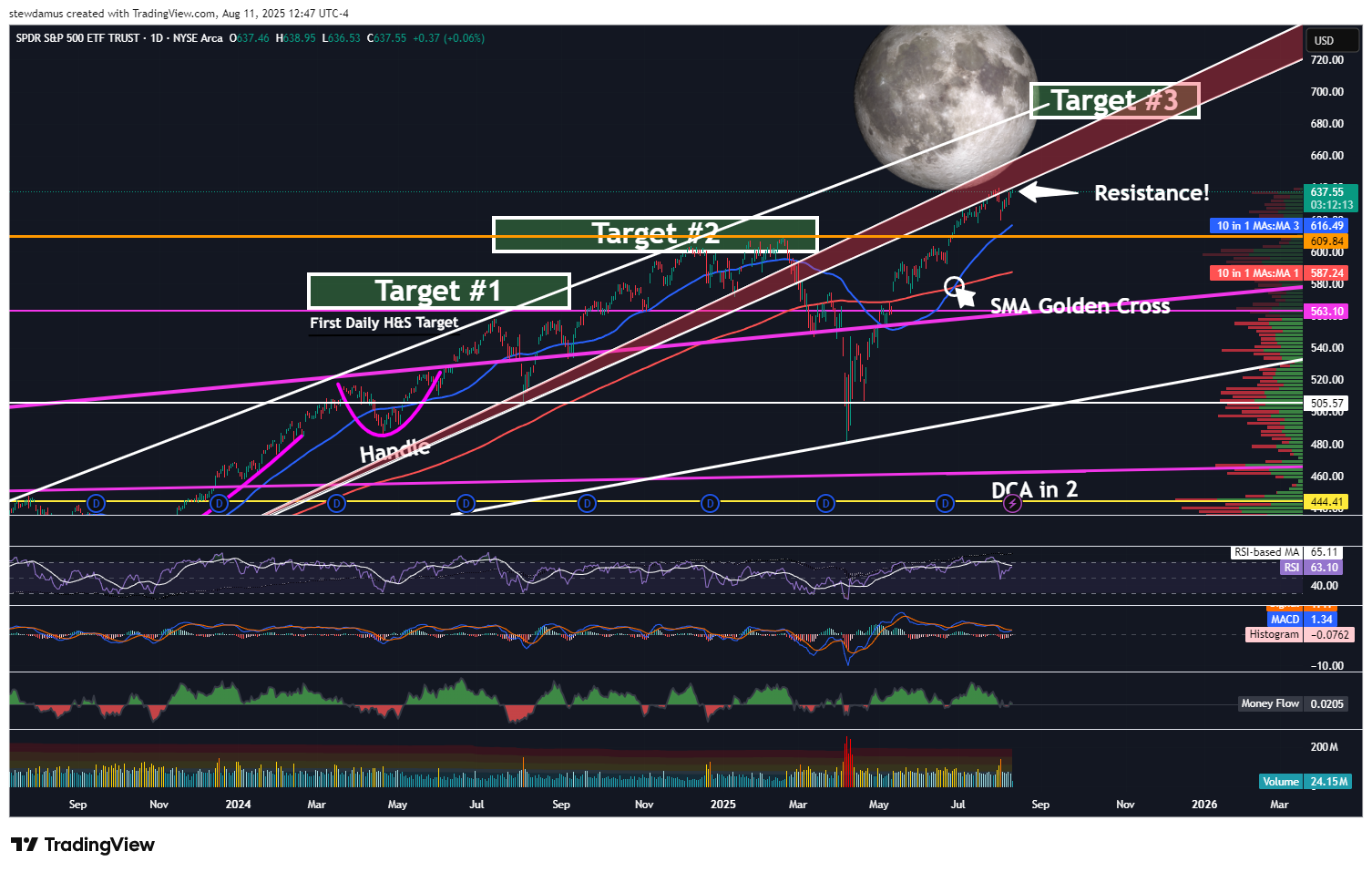 On the SPY, we have almost reached my final target of 670-700. You can see from the chart above that we are pressing up into resistance. Will it break? We’ll need good volume to do that, and to get that, we’ll need some kind of extraordinary macro-economic news: war ended, tariff surplus, capital gains tax reduction, or a tax deal, JPOW drops rates lower than expected …something like that could push us through if it were known to make a positive economic impact. Otherwise, it’s possible we simply continue drifting slowly upwards on the underside of that resistance channel.