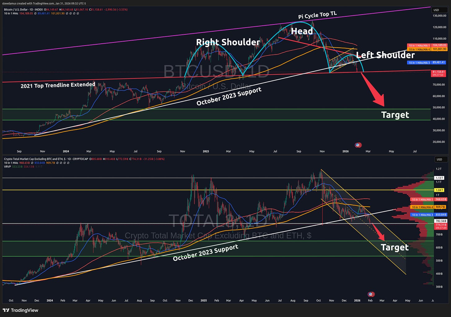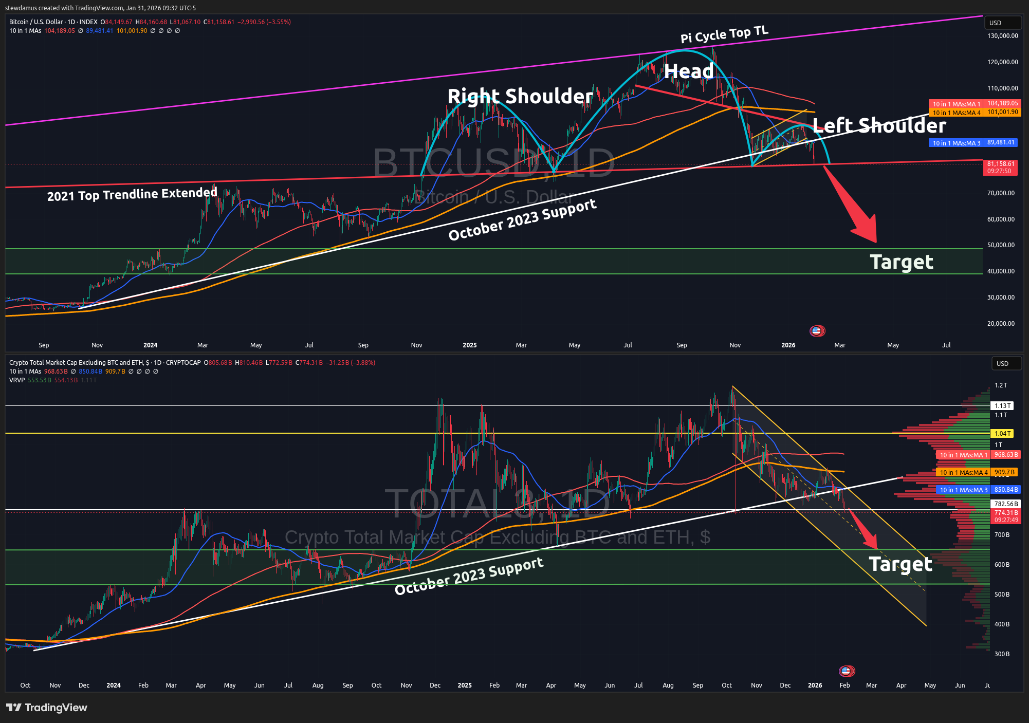 Surprisingly, altcoins appear to be able to fair better. The target I have drawn for the Total3 chart represents a 25-30 percent loss.