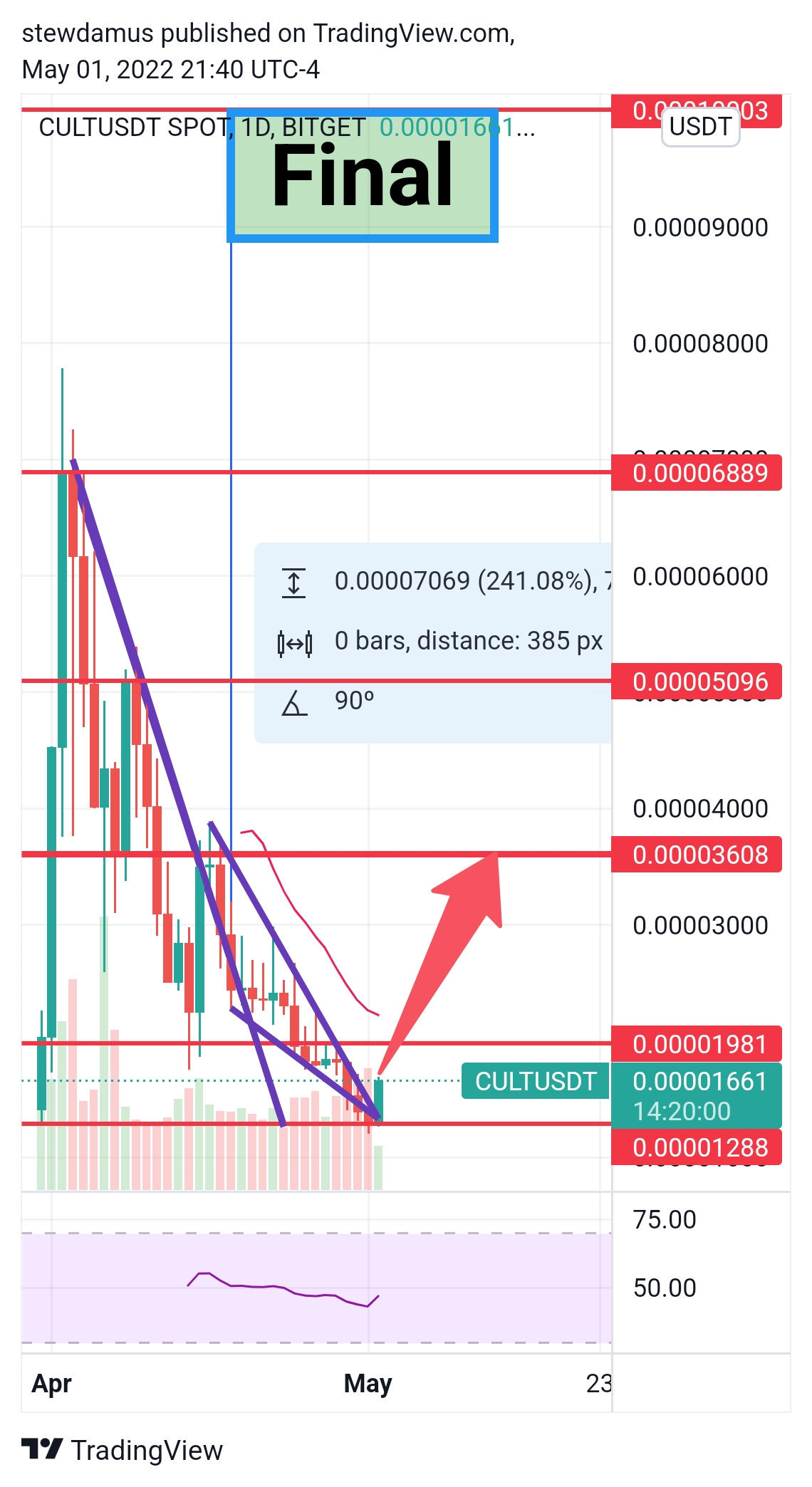 We are now breaking to the upside of our bullish descending wedge on Cult. There will, of course, be various resistance levels along the way to our final target of .0001 as we aim to take out one of the zeros. But, with some patience, that target is definitely within reach. How long it will take us to get there is the big question.
