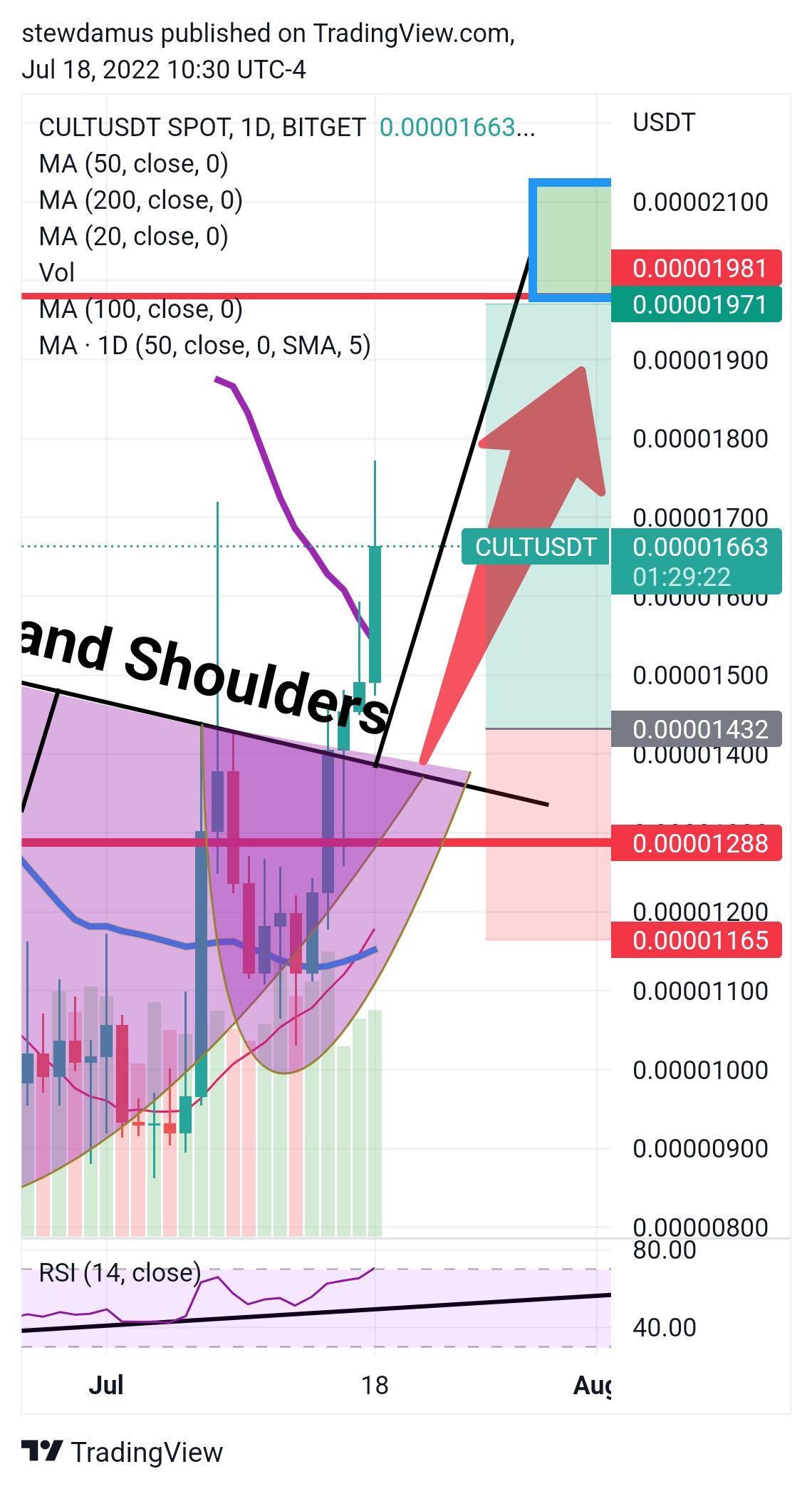I mentioned CULT flashing a bullish signal which could net traders up to 45% profit! That signal is currently playing out. CULT has reached its first target, the 100-day moving average, and is now on its way to final target.