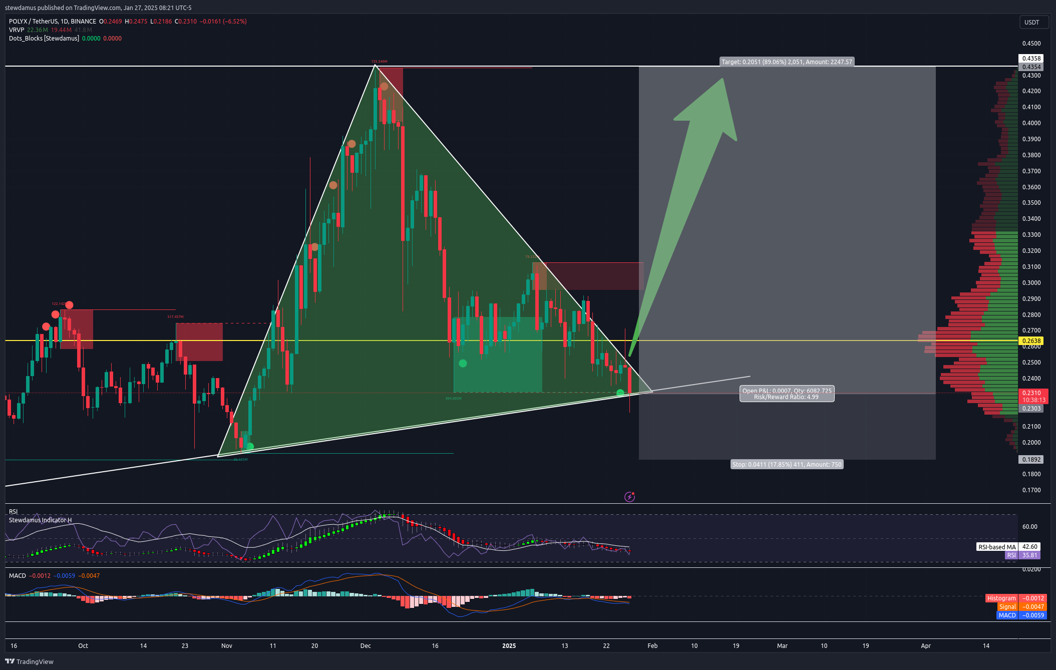 For our trade portfolio, we will continue to look for long entries, but only the best. One such entry was posted yesterday for $POLYX. My indicator had given us a green buy dot within our pivot low liquidity block as seen here:
