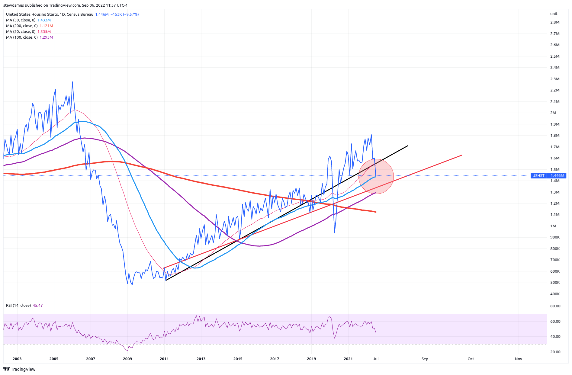 Another data point I am watching is U.S. housing starts. You can see that, from a technical perspective, I have two major trend lines drawn. Both start 11 years ago in 2011. The black ascending trend line we have only broken below a few times in those 11 years. Only the Fed’s continued money printing lifted us back above. The bottom red ascending trend line, which we are quickly approaching, is significantly more disconcerting. Starts are currently resting on the 50-day. Should it break below, it will want to test this support once again. Any break below the red trend line would have serious implications for the future of the U.S. economy as the housing market typically leads the way in the U.S. economy. The fed will also watch this data closely for any future rate hike decisions. Going too strong may drive it below and trigger a recession or more.