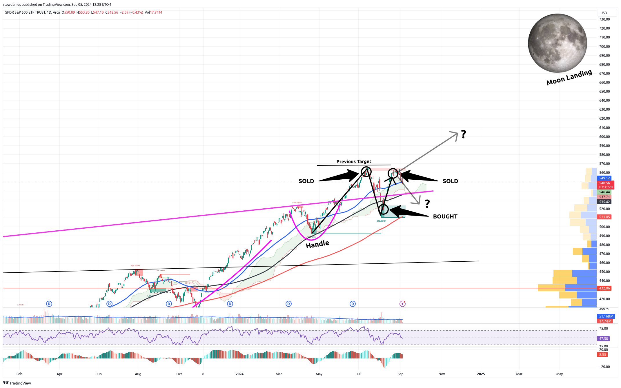 As expected, SPY double-top looks to be playing out. I don't expect us to drop much lower than the pink ascending trendline. Maybe we'll touch that 200 dma before our full send. Let me remind you that the pink ascending tl is the neckline of a large cup and handle pattern on the bi-weekly, the target of which remains 650-700. This is still in play on the longer timeframe and as long as we don't break below the pink tl with confirmation on the weekly, I will start to buy back at or around the pink tl and down to the 200 dma. Batting 1000% thus far and hoping to keep it perfect.