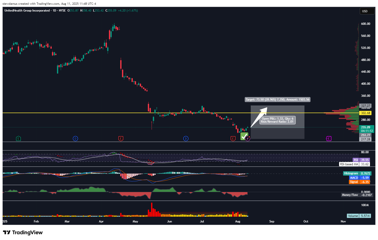 I'm not going to go into a long exposé about how great the technicals are here because, truthfully, they are not great. In fact, there is relatively little that supports any kind of entry here other than the fact that this stock is extremely oversold. Really, the only reason I even considered an entry here is that my indicator has given me a buy. If you have been following me for any length of time, you know that this thing is knocking it out of the park in stocks. But to keep it safe, I am entering a 1:2 long rrr, shooting for $327 with a $217 SL. Let's see if my little indicator can keep its amazing win streak going even without a lot of technicals to support it.