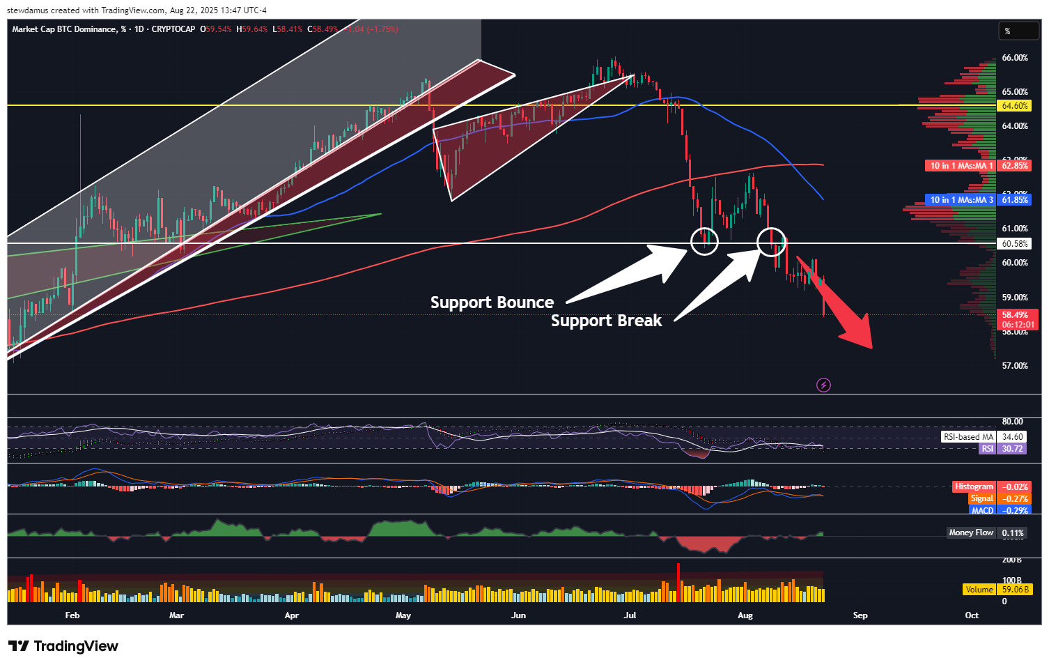 Likewise, Solana has pushed back above support and is threatening a $200 break as I type. My followers know that we watch what the broader market does first, generally, by tracking the SPY chart. We know that this then flows over to Bitcoin. It has. We then kept a close eye on Bitcoin dominance next. Any indication that dominance is getting weaker is our first signal that altseason is near. Dominance continues to tumble (below).