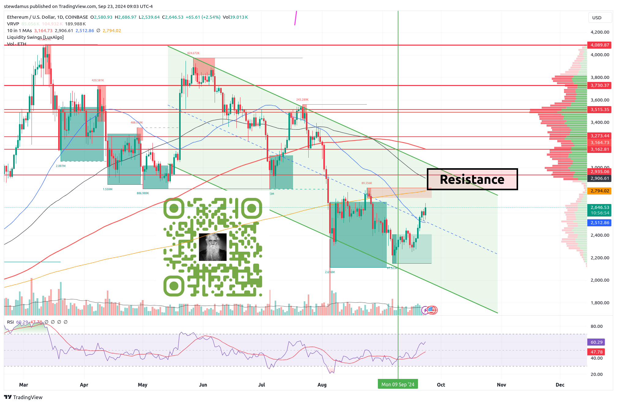 Ethereum flashed green on my indicator system on the 9th of September. I don't see much resistance until we move into that $2800 area. Our first resistance area will be that block of sell side pressure which coincides with the 350 DMA. Above that we have the top of our channel which coincides with an area of higher volume according to the VRVP. This is where I will begin watching closely for my indicator system to flash red. Of course, we could always break the top of our channel and continue up. The bulls will have shown a lot of strength to do so. I will try to keep you posted as Ethereum tends to lead much of our altcoin space.