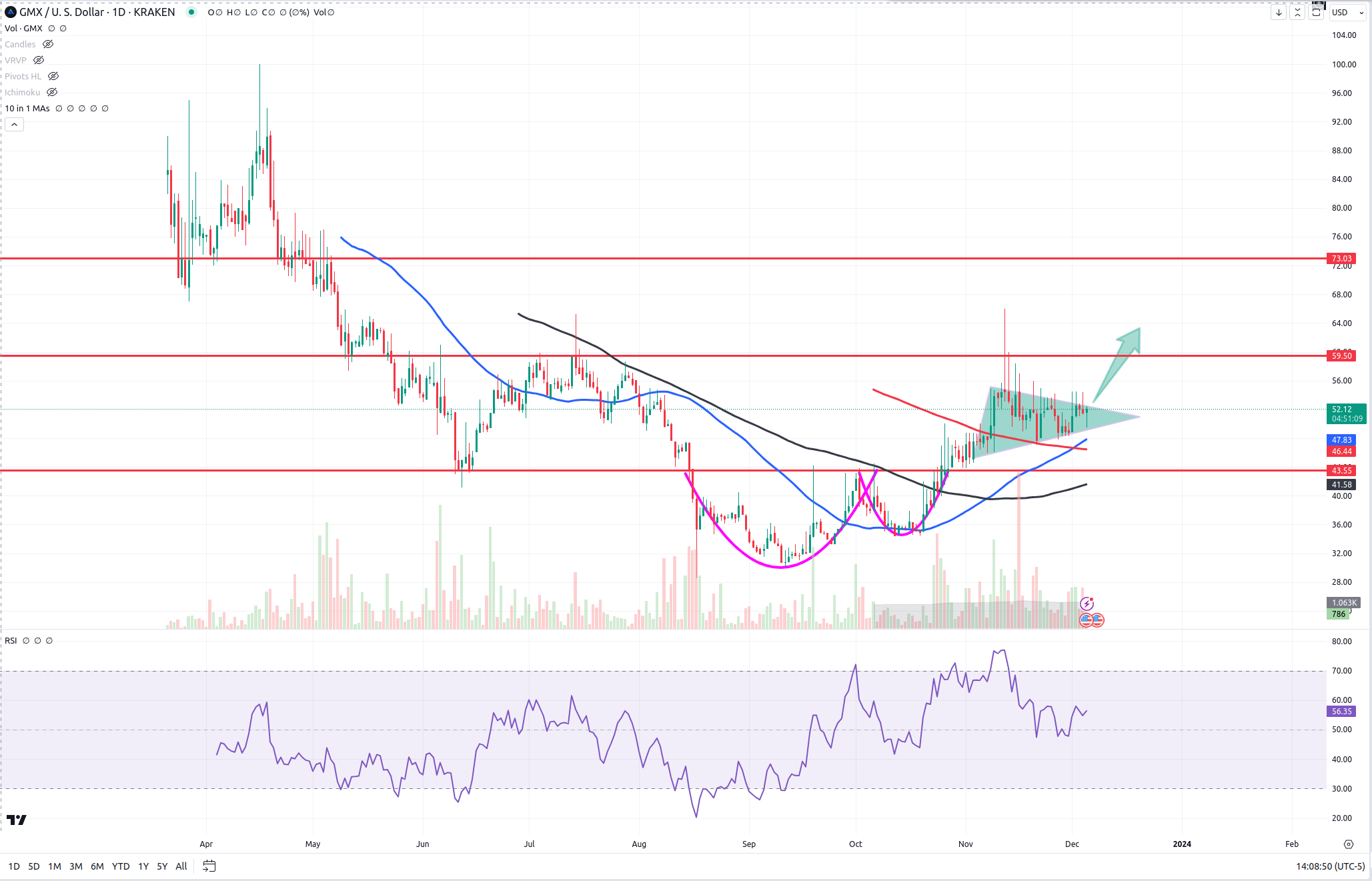 After having reached its Cup and Handle target, GMX has now formed a beautiful bull flag and looks like it will move to at least $59-60 dollars. If it really gets a head full of steam, I can easily see it tagging $73.