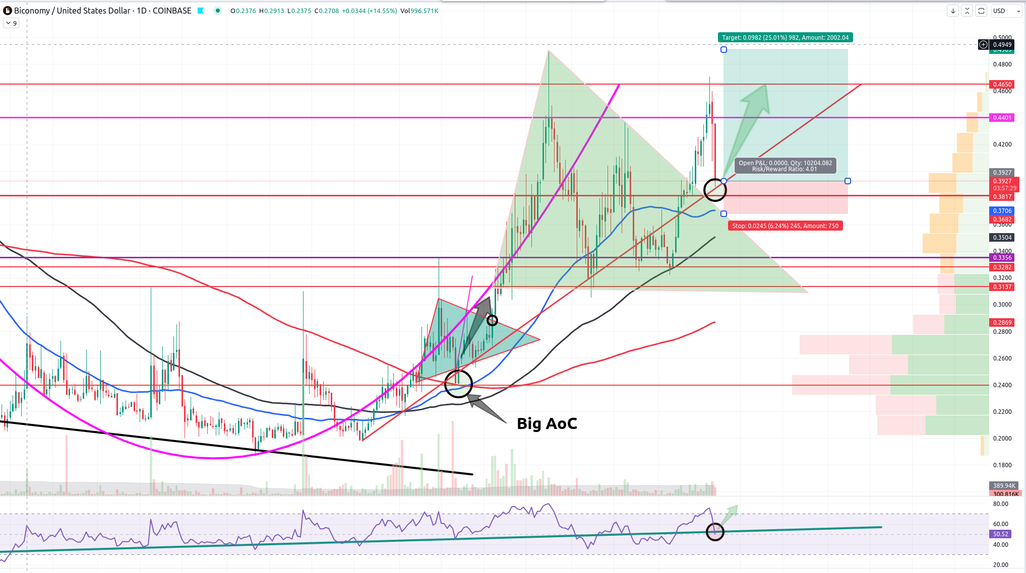 Bico has found support in the price chart and on the RSI. I will buy this dip here and set my final target at 49 cents. SL will be 37 cents with a RRR of 4 to 1.
